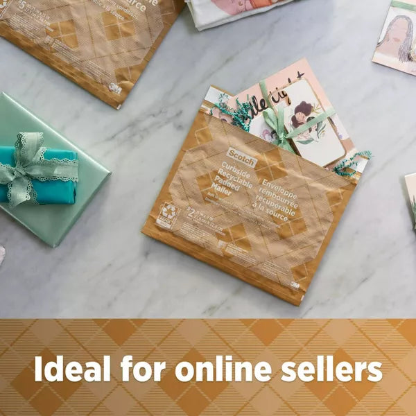 Scotch™ Curbside Recyclable Padded Mailers feature a durable multi-layer paper-based construction that protects your items and are curbside recyclable. These self-sealing mailers provide similar impact protection as traditional bubble mailers and offer water resistance during shipping. While lightweight, these mailers are built to withstand rough handling.