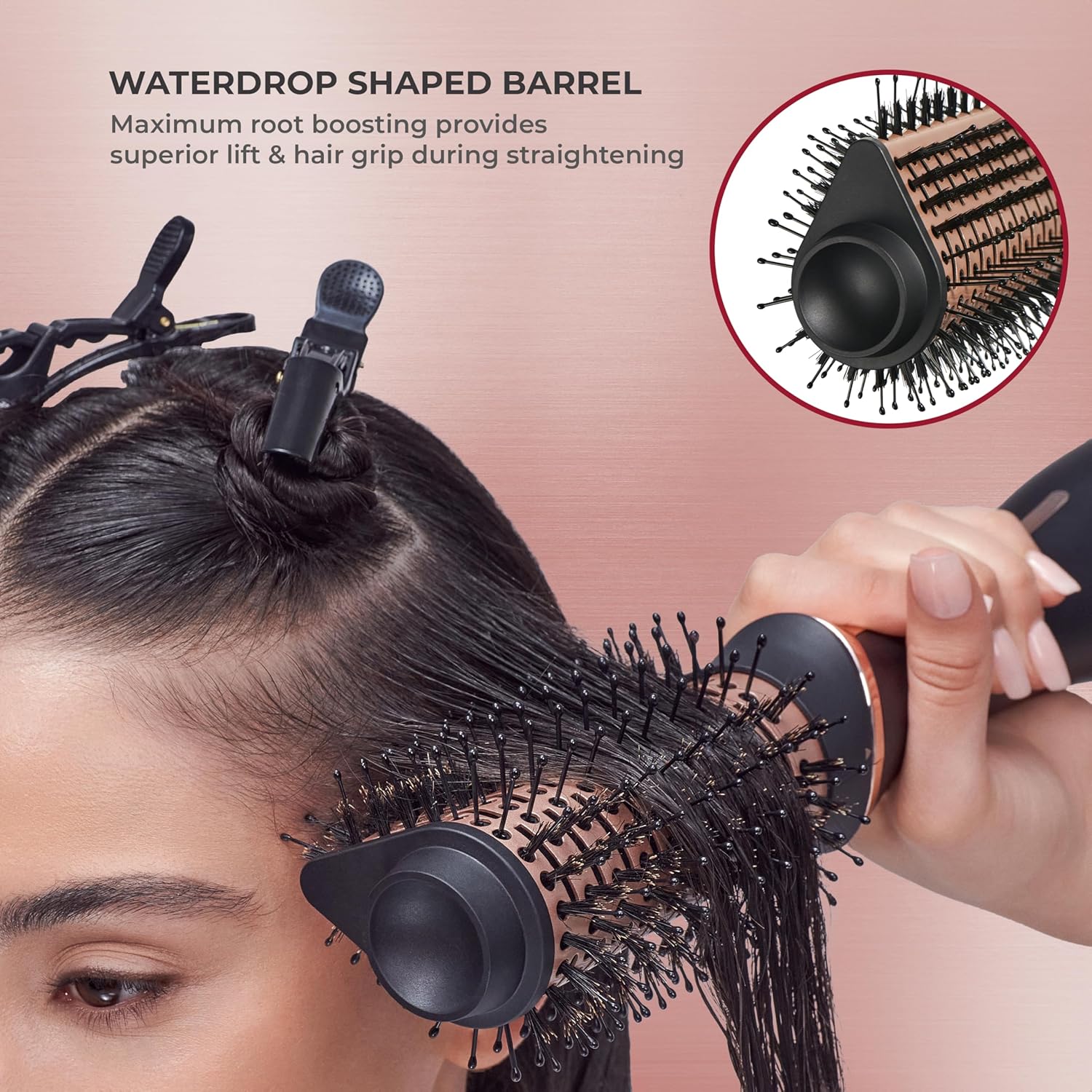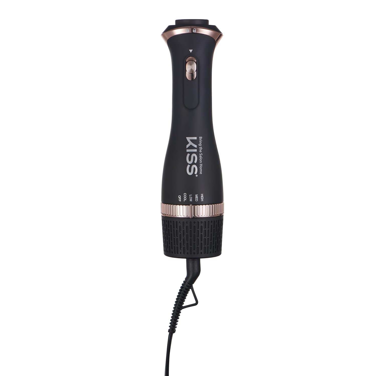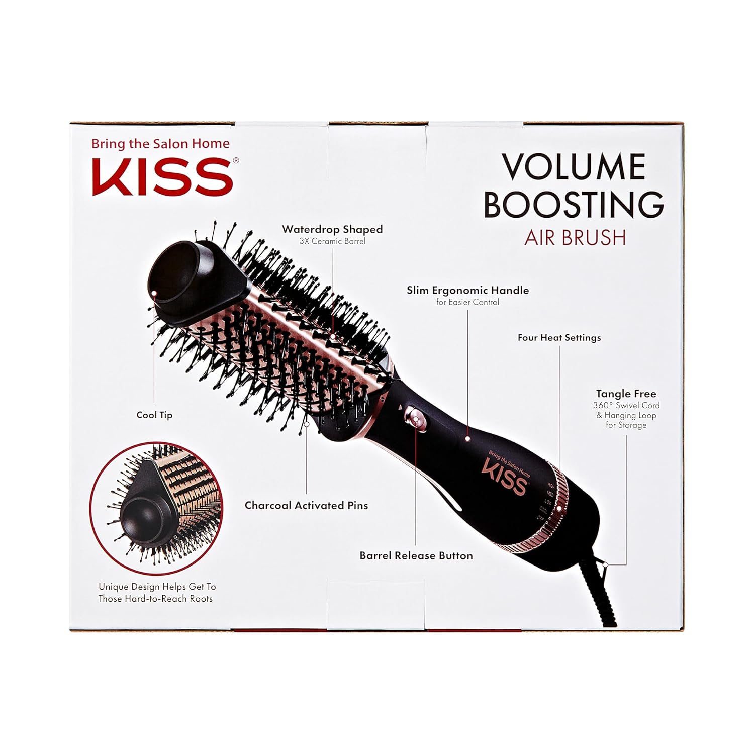 Get salon-quality, voluminous hair with the KISS Volume Boosting Hot Air Brush. Its waterdrop shaped barrel effortlessly reaches roots for maximum lift and grip during straightening, while the ceramic titanium barrel reduces heat damage. The slim ergonomic handle and 360⁰ swivel cord provide easy control and the tangle-free bristles make styling hassle-free. Customize your look with four heat settings and interchangeable brush heads. Elevate your styling game now!