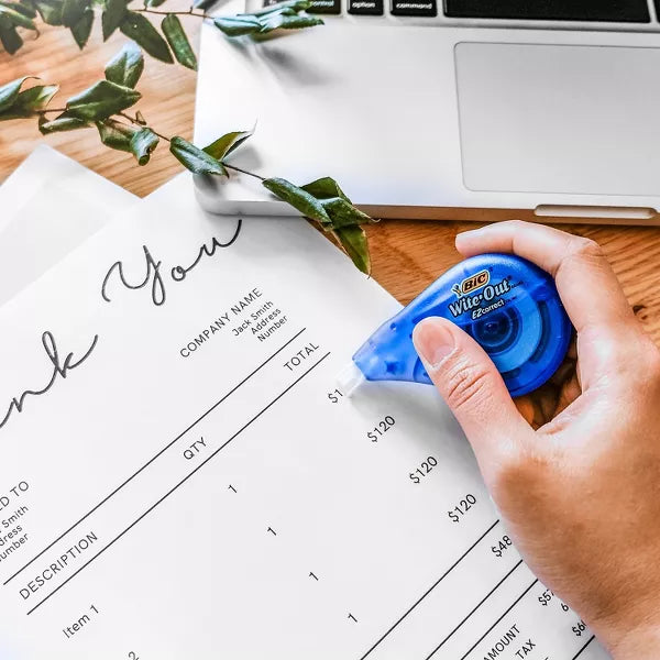 Make fast, easy and precise corrections on even the toughest errors with BIC Wite-Out Brand EZ Correct Correction Tape. This tear-resistant, film-based BIC Wite-Out Brand Correction Tape comes in a tape dispenser that offers maximum comfort and control, so you can easily and accurately correct mistakes. The tear resistance offers tidy, inconspicuous corrections that last. Similar to our correction pen, the correction tape requires no dry time and won’t bleed or drip, so you can instantly write or type your corrections over it.