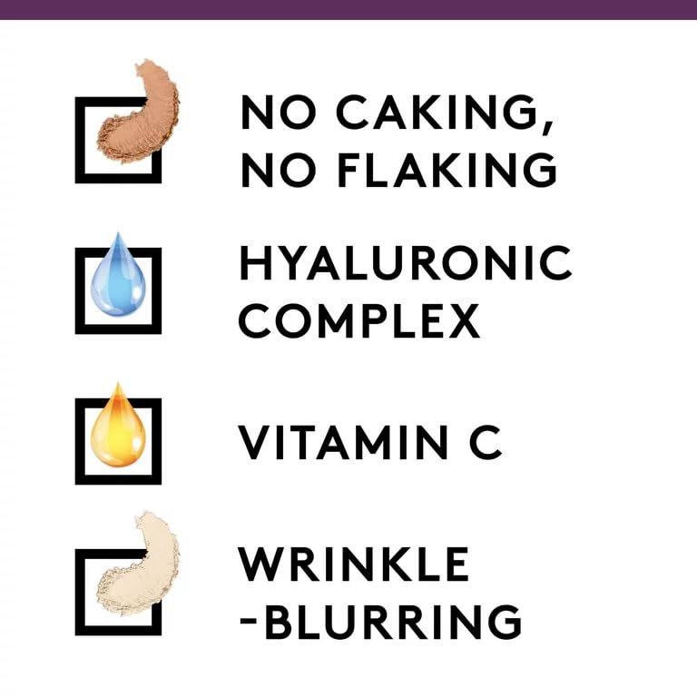 Instantly reduce the look of fine lines and wrinkles with COVERGIRL Simply Ageless Instant Wrinkle Blurring Pressed Powder. This hydrating face powder goes on creamy and does not cake or flake for a flawless finish. The pressed makeup powder is formulated with hyaluronic acid and vitamin C to refresh the complexion and even out skin tone. Perfect for on-the-go touch-ups, the matte pressed powder makes pores less visible and floats over fine lines and wrinkles to deliver youthful-looking skin. Pro-tip: Use this pressed powder to set your Simply Ageless Foundation!