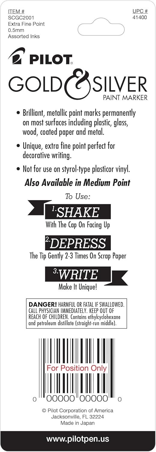 The Pilot Metallic Permanent Paint Markers 2 pack includes one silver and one gold marker. These vibrant markers leave permanent, decorative marks on a variety of surfaces such as plastic, glass, wood, coated paper, and metal. Perfect for labeling items like tools, sporting and electronic equipment, these markers stand out on dark backgrounds and are ideal for crafts.