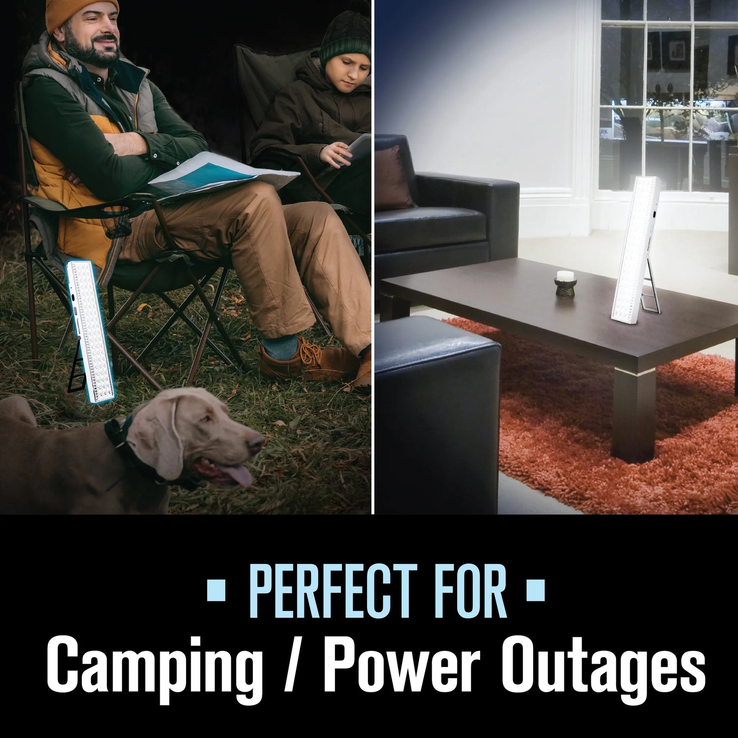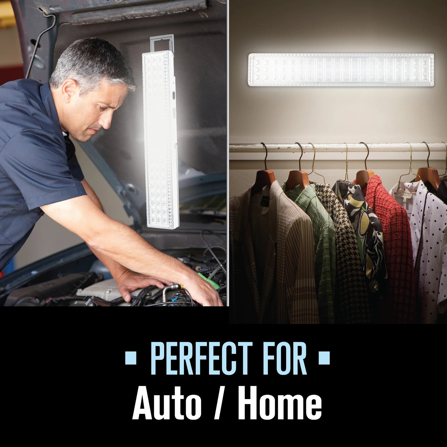 The Bell + Howell Lightbar is a compact, lightweight LED light perfect for garages, attics, closets, workbenches, outdoor use, camping, and beyond. Featuring 60 LEDs, it delivers 720 lumens to illuminate any area effectively. Rechargeable and offering two brightness settings, this versatile light can stand steadily on flat surfaces or be easily mounted on walls with included hardware, providing convenient, powerful lighting wherever you need it.