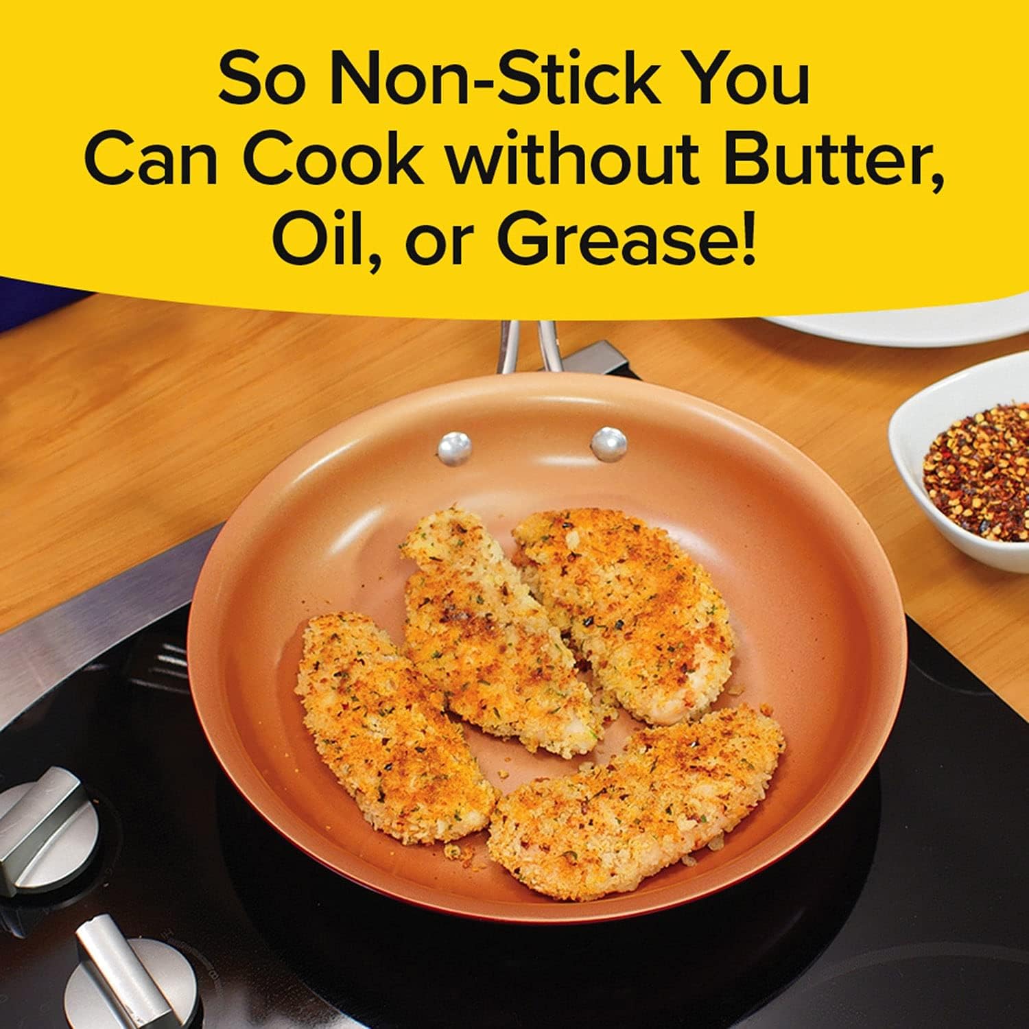 The BulbHead Red Copper Pan is a 10-inch skillet infused with copper and coated with a durable, high-heat ceramic surface that resists peeling, chipping, and scratching without PFOA or PTFE. Its naturally non-stick ceramic layer lets you easily cook breakfast meats, eggs, vegetables, and more. Aluminum rings provide even heat distribution to eliminate hot spots. Safe for stovetop use and oven-ready up to 500°F, it’s perfect for browning, searing, and finishing dishes. Hand wash only, season with vegetable oil before first use, and use soft utensils to maintain its surface.