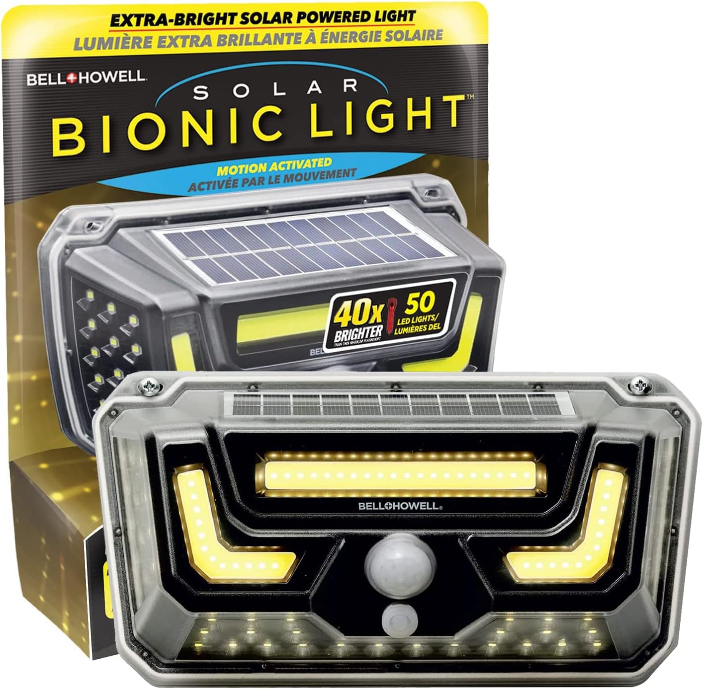 The Bell + Howell Solar Bionic Light uses solar power to brighten your outdoor spaces without adding to your electric bill. With 50 super bright LEDs and two lighting modes, it provides warm, relaxing light that activates automatically when motion is detected up to 26 feet away. Installation is quick and simple—just stick it on or use the included hardware, no wiring or batteries needed. Perfect for patios, pathways, and entryways, it offers efficient, hassle-free lighting wherever you need it.