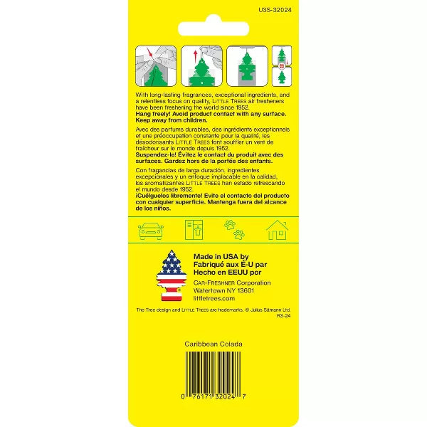 As the global symbol of freshness and quality, Little Trees hanging air fresheners have been making life smell better since 1952. Trees provide premium fragrance that delivers long lasting results in the home, office, or on the road! Caribbean Colada is an escape to a tropical island with juicy pineapple and sweet coconut.