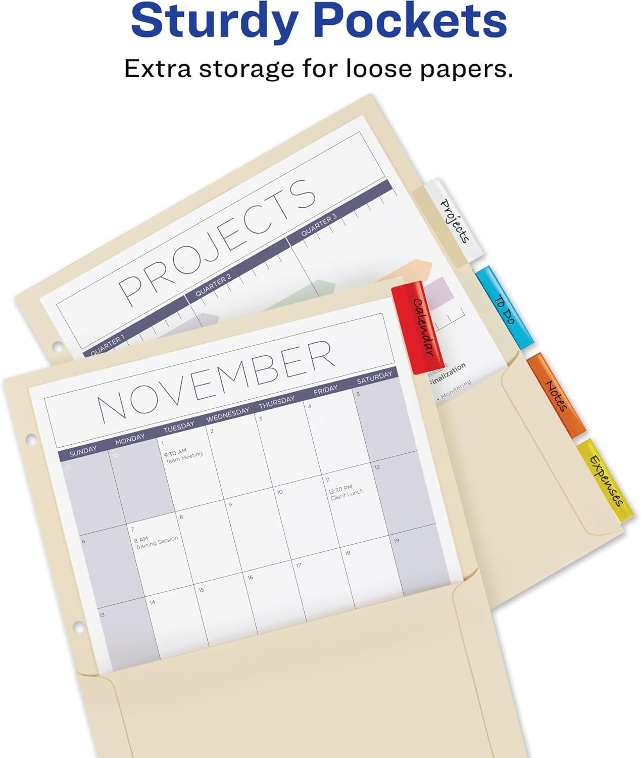 Avery Insertable Pocket Dividers feature tabs that extend beyond sheet protectors, keeping titles clearly visible. These durable binder dividers provide secure pockets for additional storage. The insertable plastic tabs hold your inserts firmly in place, preventing them from slipping out. Made from reinforced manila paper with sturdy holes, they resist tearing and are three-hole punched for immediate use. Perfect for organizing and protecting your documents efficiently.