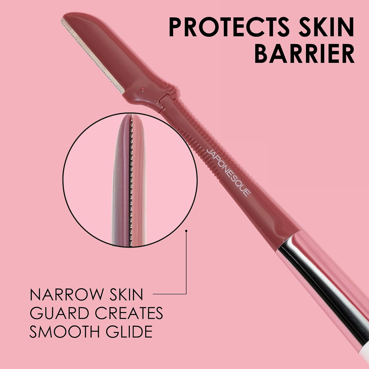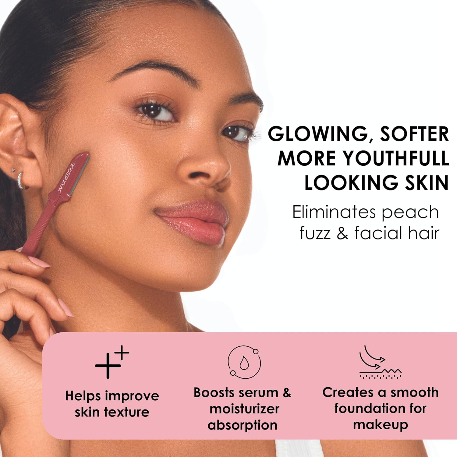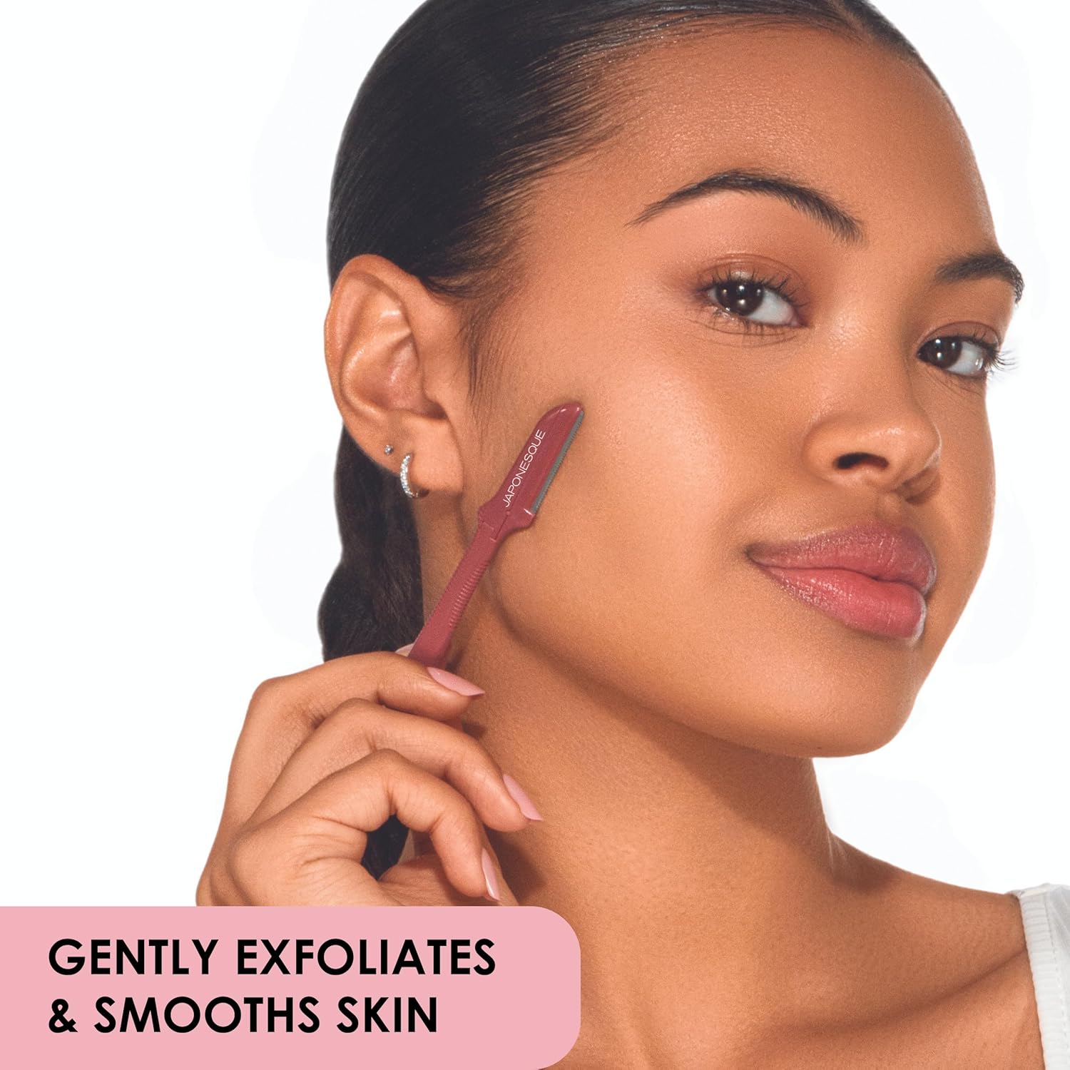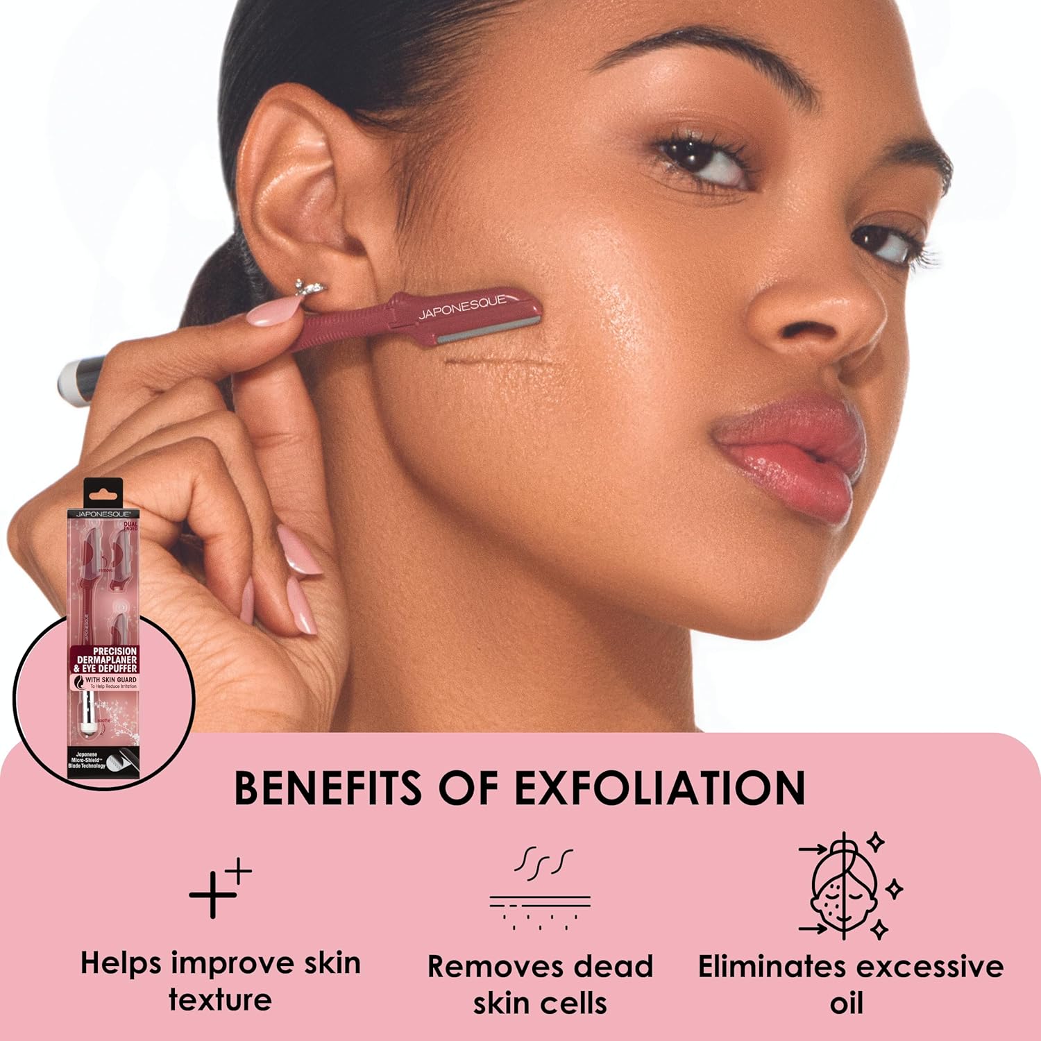 The JAPONESQUE Dermaplaner and Cooling Eye Roller combines two essential beauty tools in one. Effortlessly eliminate peach fuzz and unwanted facial hair with the ultra-sharp Japanese stainless steel blade, designed for precise exfoliation. This kit includes two replacement blades and safety covers for secure storage and travel. Follow with the cooling eye roller to calm puffiness and reduce redness, leaving your skin refreshed. Enhance your skincare routine—freshly exfoliated skin allows better absorption of serums and moisturizers while providing a flawless base for makeup.