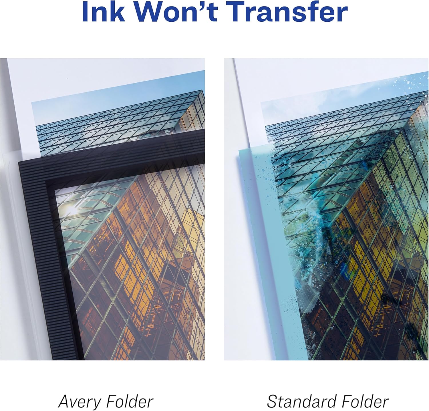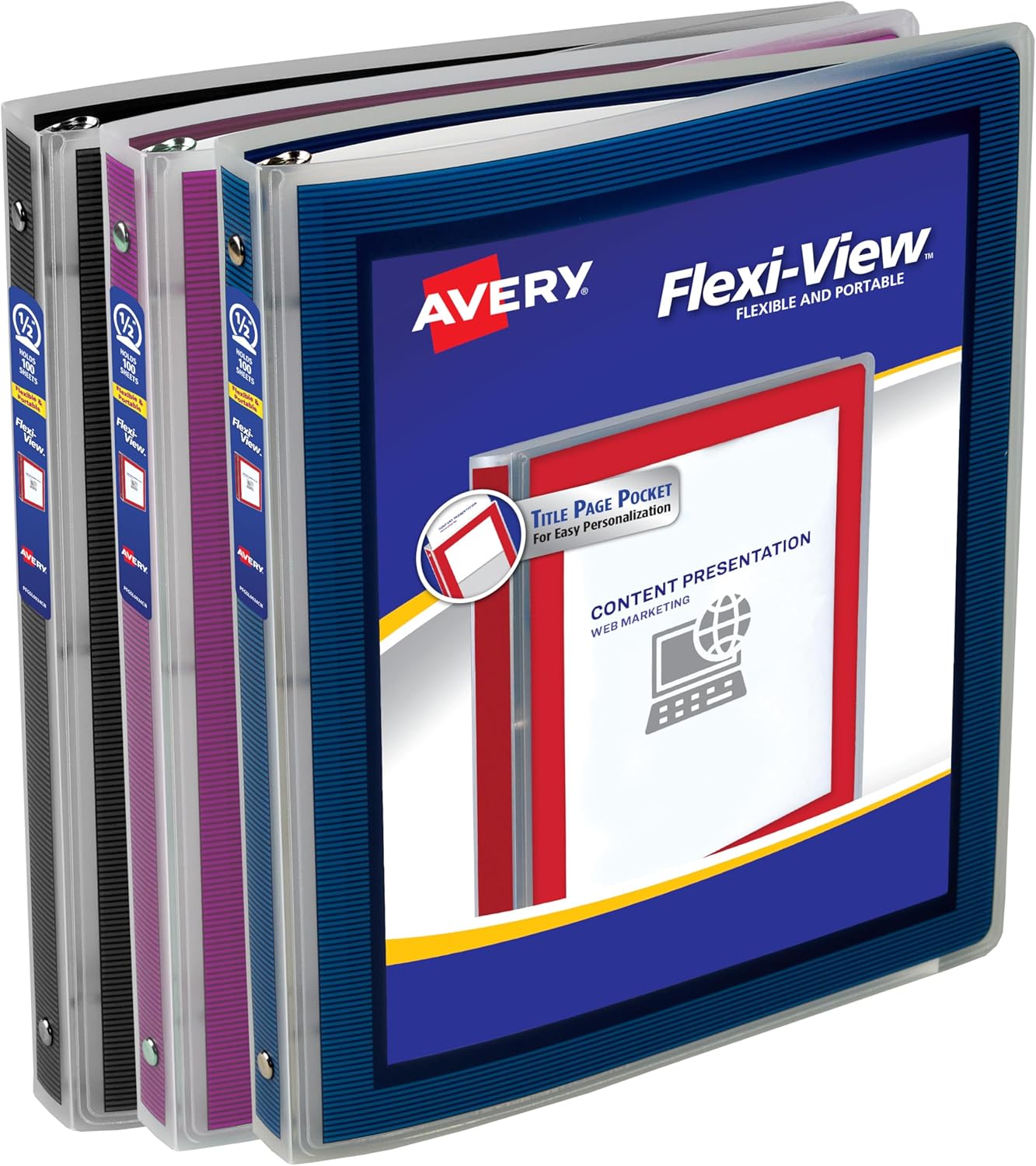 The Avery 0.5" Flexi View Binder features a stylish preprinted frame that highlights your report or presentation’s title page while keeping documents organized in durable, non-stick polypropylene. With a clear pocket and business card holder inside, plus the ability to customize covers using free Avery templates, this binder holds up to 100 pages and comes in black, burgundy, and navy blue.