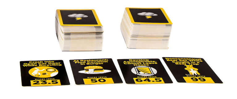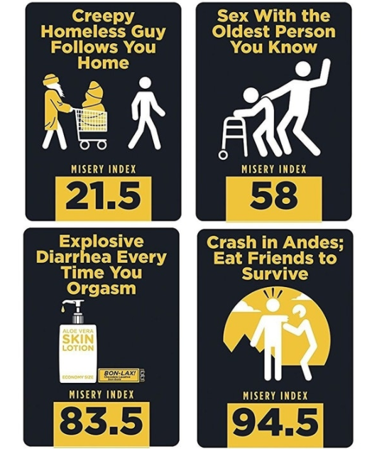 You're going to read some really messed up stuff on these cards, and then rank them based on how bad they really are. Is a 3rd degree sunburn better or worse than seeing your father naked? Is it worse than dropping your phone in the toilet? Rank the card, and if our Misery Index agrees with you, you get to keep it. Correctly rank 10 cards to win!
