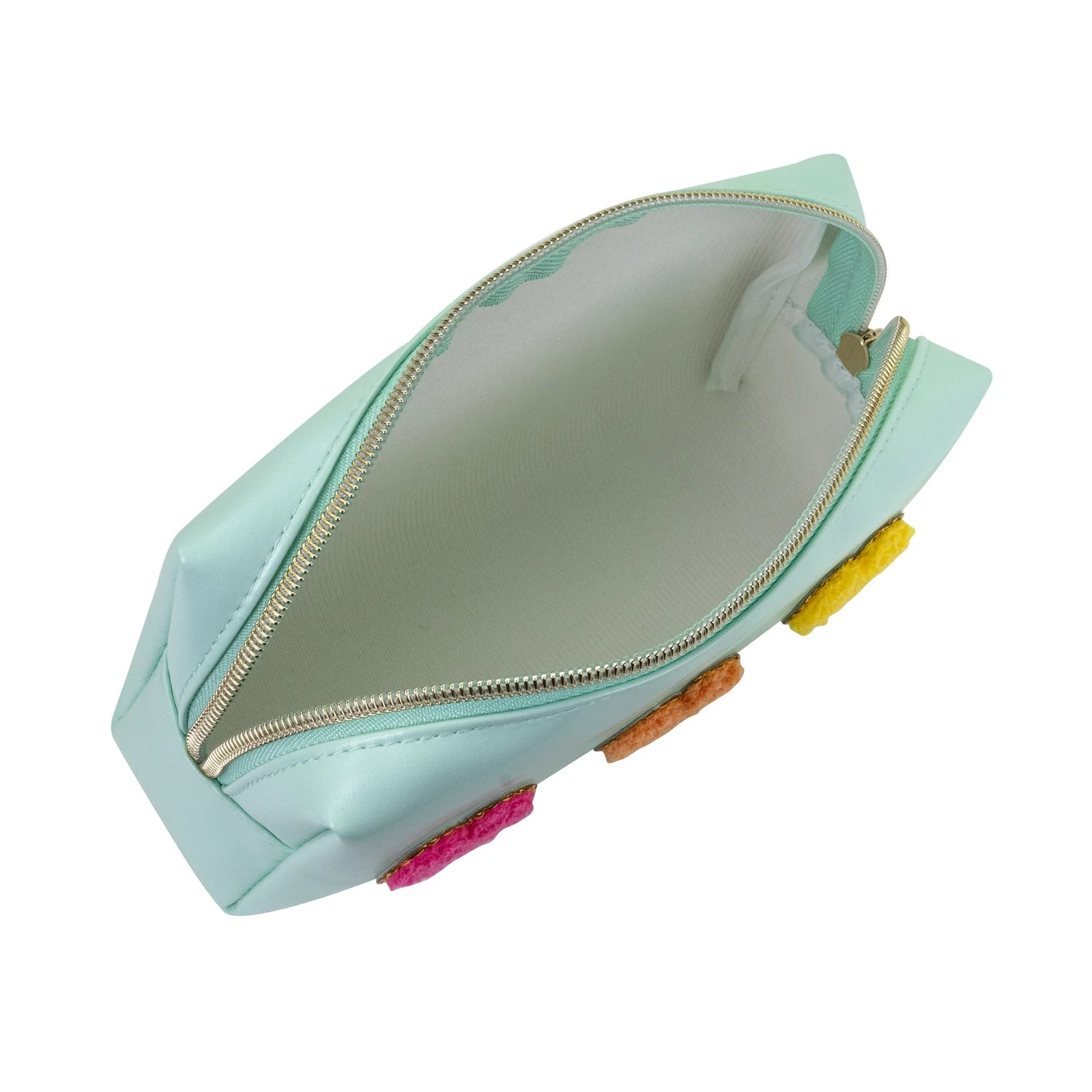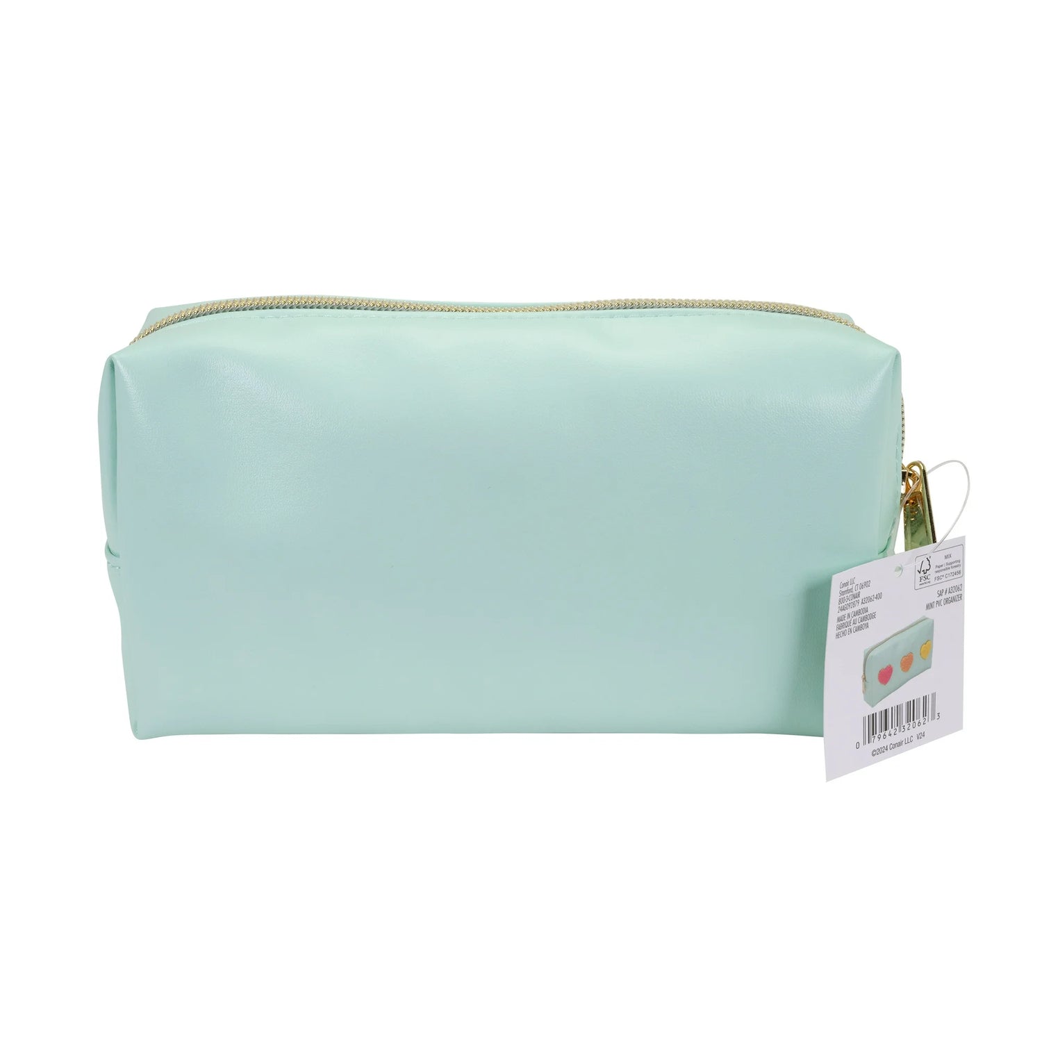 This mint green organizer features a roomy single-zipper compartment perfect for keeping your makeup and essentials neatly arranged. Decorated with three soft fabric hearts in pink, yellow, and orange, accented by gold-tone trim, it combines fun and style effortlessly. The gold-tone coil zipper and matching metal pull add a touch of sophistication, making this organizer an elegant choice for managing your beauty items wherever you go.
