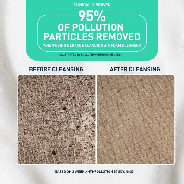 CeraVe Balancing Air Foam Facial Cleanser is a dermatologist-developed foam cleanser designed to care for normal to combination skin—especially those managing oiliness and dehydration at once. This fragrance-free, non-comedogenic foaming facial cleanser gently lifts away dirt, oil, and impurities without disrupting your skin’s natural barrier. Powered by innovative Glycolysine™ Cleansing Technology, it delivers 8-hour oil control and 24-hour hydration in a lightweight, sensorial foam.
