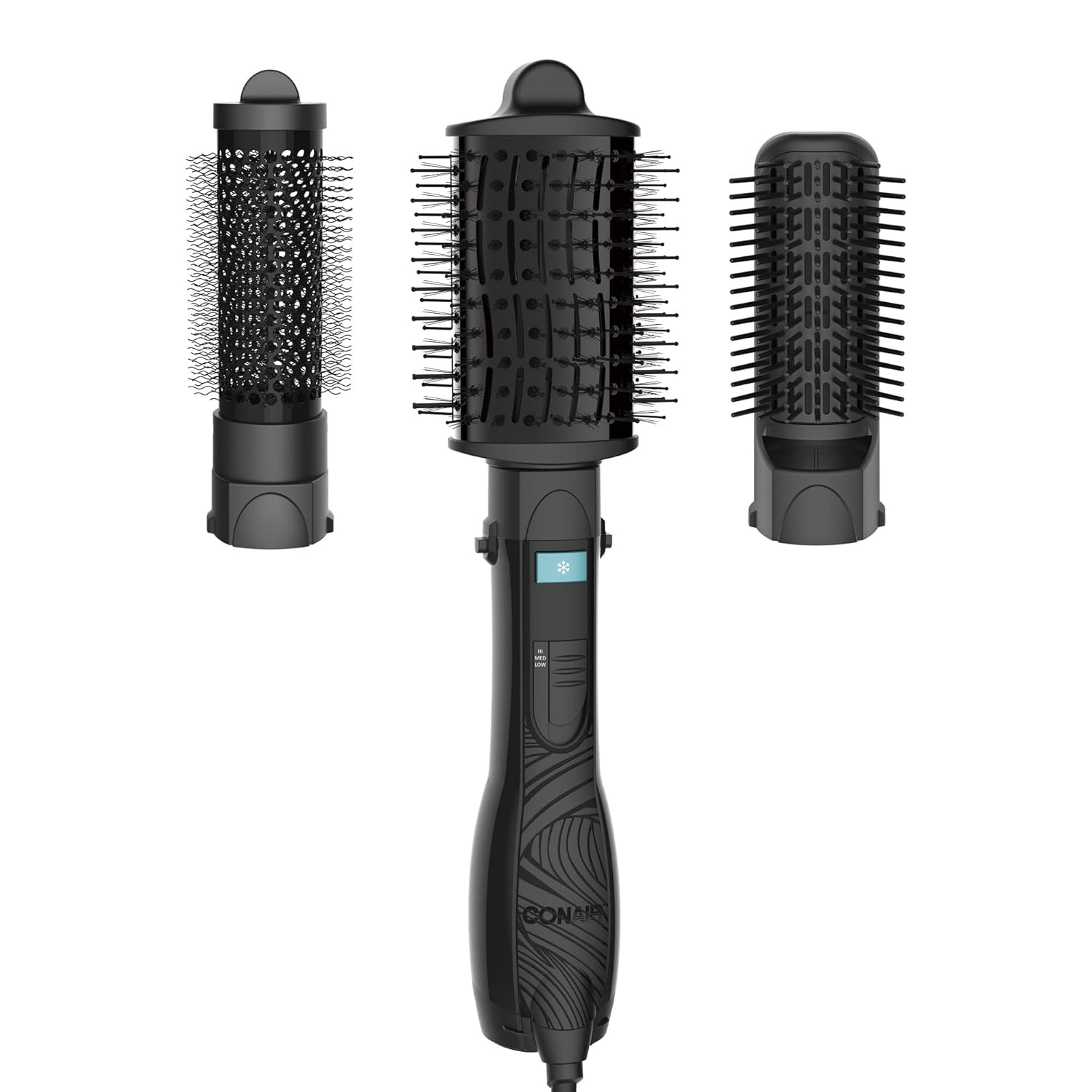The Conair Curl Collective Hot Air Blowdry Brush is designed specifically for curly hair, offering three interchangeable attachments to achieve a flawless blowout, enhance your curl pattern, or completely change your style. Featuring ionic technology to reduce frizz and ceramic components to minimize heat damage, this tool protects your hair while delivering professional results at home. With two heat settings, a cool option, and 1000 watts of power, it quickly styles damp hair and refreshes your look between washes for wavy, curly, or coily hair types.
