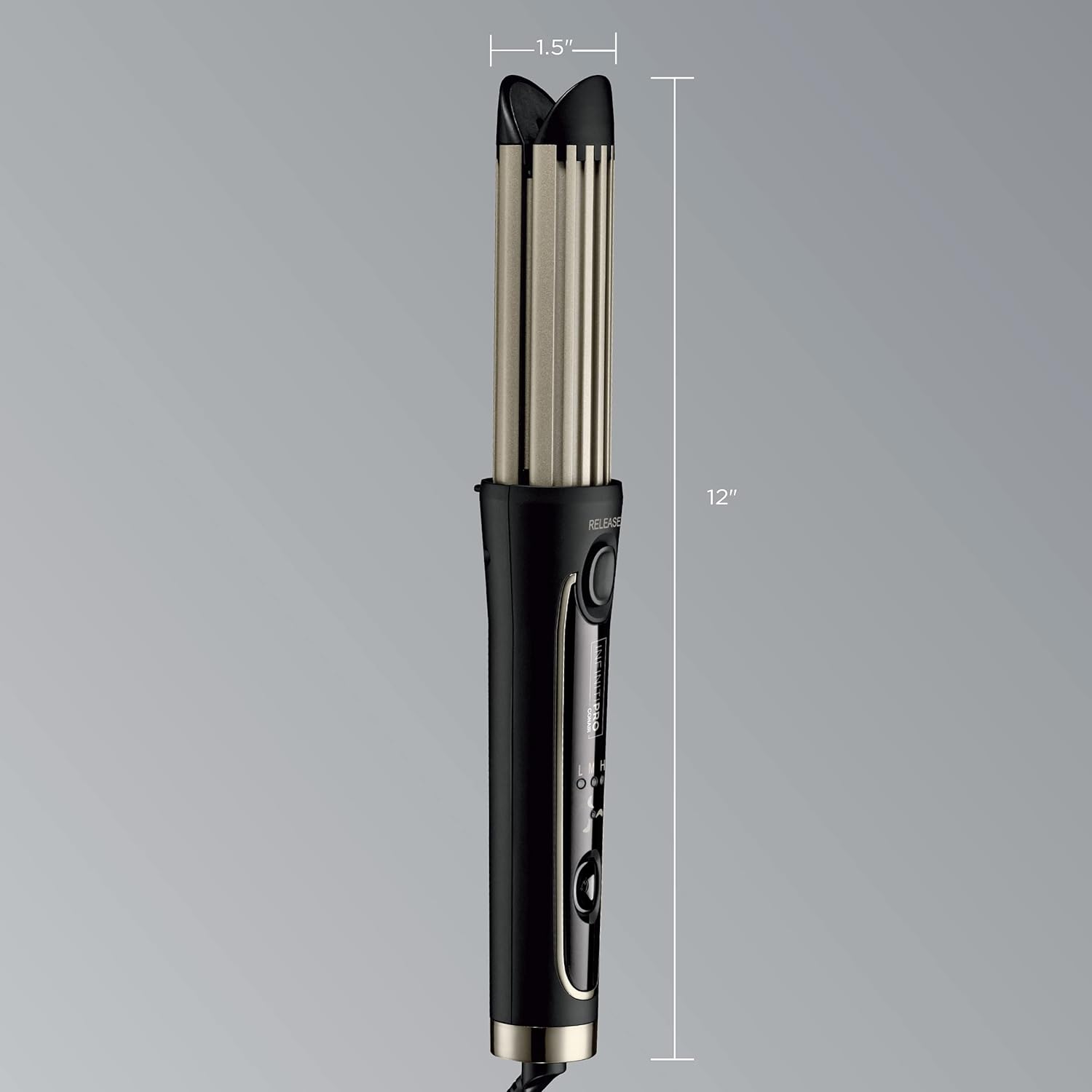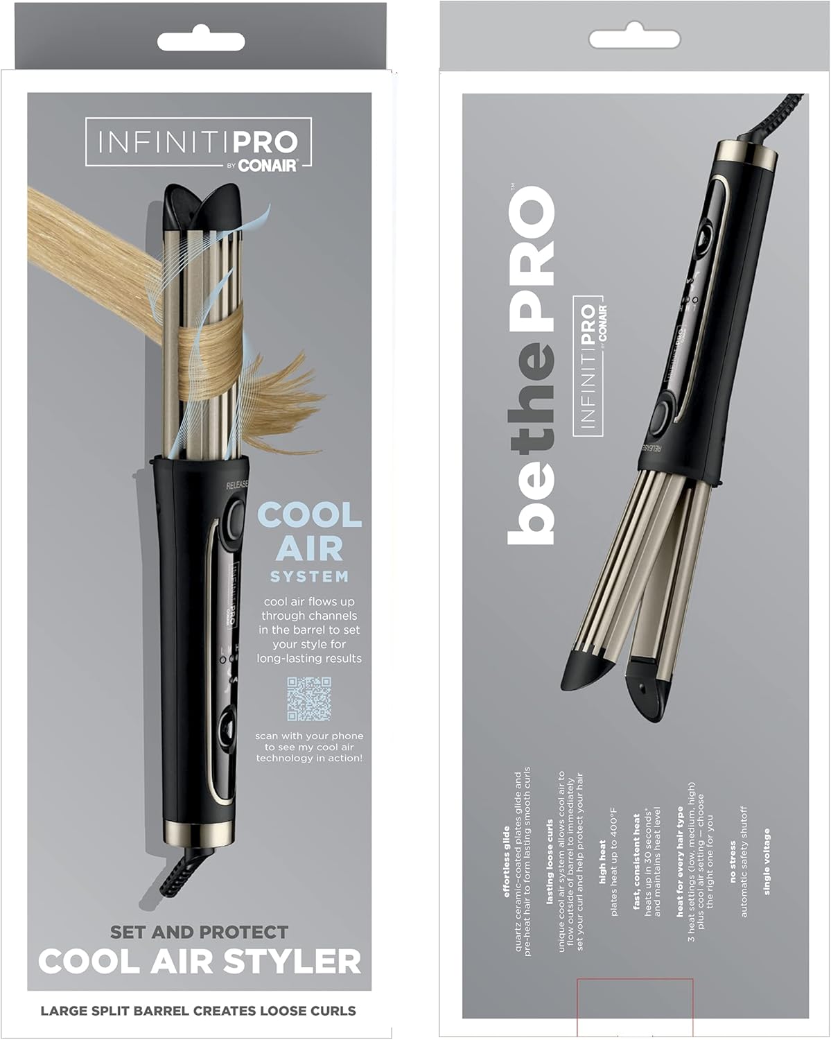 The InfinitiPRO by Conair Cool Air Curler features a 1.5" barrel and quartz ceramic-coated plates to create smooth, long-lasting curls with ease. Its unique cool air system sets curls quickly while protecting your hair from damage, and offers three heat settings up to 400°F to suit every hair type. With a fast 30-second heat-up and automatic shutoff for added safety, this styling tool takes the stress out of achieving salon-quality curls.