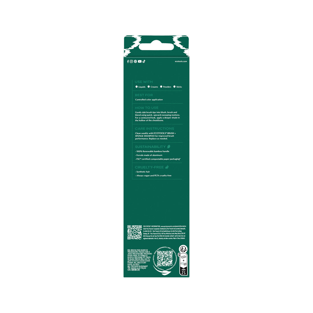 The EcoTools Precision Blush Brush is designed with a unique square cut to control color application for a perfectly sculpted cheek. Simply dab this beautifully soft, handcrafted brush in cream or powder color. Apply in an oval shape at the top of your cheekbone blending outwards towards the hairline. For a contoured look, apply a deeper shade in the hollow of the cheekbone. Best of all this brush is made with sustainability in mind. It is cruelty-free and made with recycled aluminum and plastic. Even the packaging is made with 100% tree-free paper, and the brush handle is made of our recycled, renewable bamboo. Customize your beauty routine and get creative with the EcoTools Precision Blush Brush. The EcoTools Brushes feature our signature smooth, renewable bamboo handles, synthetic Taklon bristles, and sleek ferrules made with recycled aluminum for a clean beauty experience.