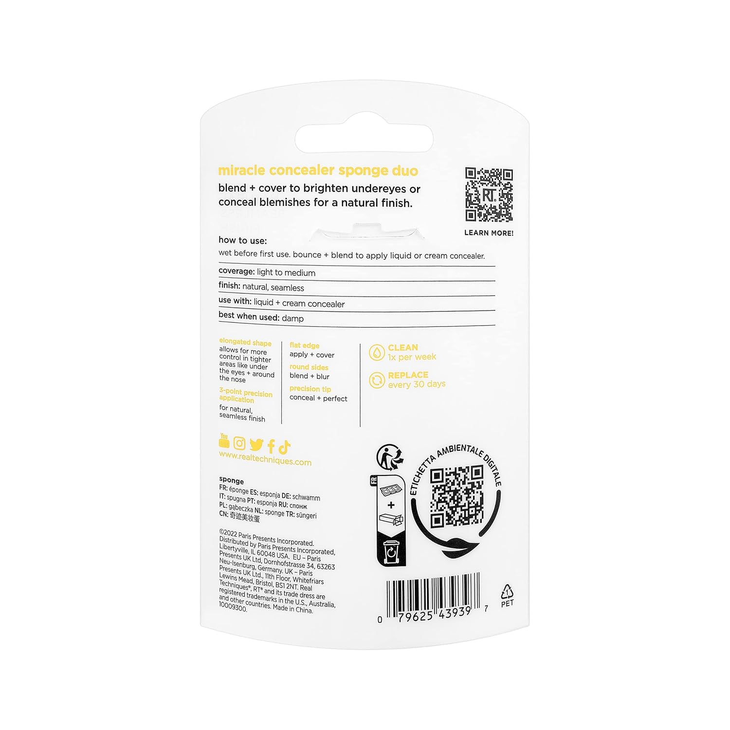 The Real Techniques Miracle Concealer Sponge features a slim, elongated design for precise control in hard-to-reach areas. This pack includes two sponges perfect for applying liquid and cream concealers with ease. Its small precision tip ensures flawless coverage under the eyes and around the nose, delivering a natural, smooth finish. For optimal results, use the sponge damp to effortlessly blend your concealer.