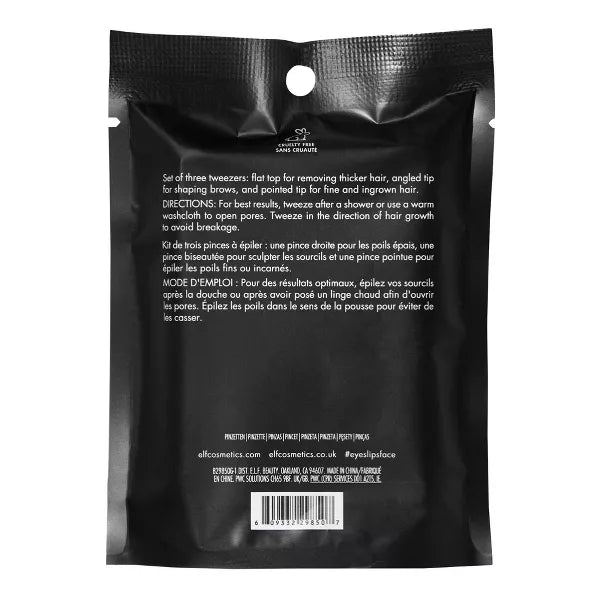 Expert brow shaping is right in your hands with the easy-to-use e.l.f. Cosmetics Tweezer Trio Kit, mini tweezer set. It features three uniquely shaped eyebrow tweezers, perfectly designed for precise hair removal and effortless brow shaping. Use the flat-top tweezer to remove thicker hairs, the angled tip for flawless brow shaping, and the pointed tip for tweezing fine and ingrown hairs. Plus, the mini sizes tools are perfect for your travel bag or quick touchups on the go.
