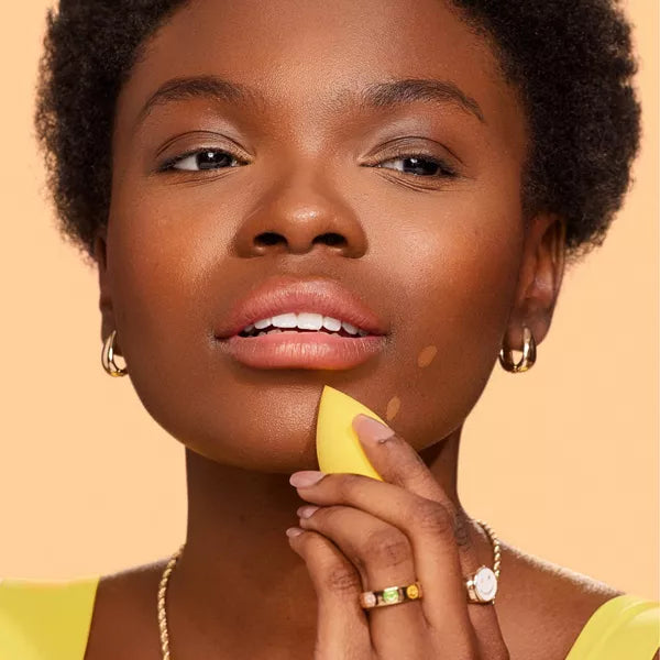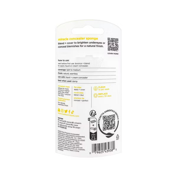The Real Techniques Miracle Concealer Sponge helps blend and conceal to brighten undereyes or cover blemishes. Our concealer sponge offers light to medium coverage for a natural, seamless finish that gives you a lifted effect. This makeup blending sponge has a unique elongated shape that allows for more precise application and control in tighter areas like under the eyes and around the nose. Real Techniques' Miracle Concealer Sponge works best with liquid and cream concealer. This makeup sponge has RT's unique 3-point application technique that makes blending like a pro easy. First use the flat edge to apply and cover, then the precision tip to conceal and perfect, and finally, blend it all out with the rounded side. The concealer sponge is best used damp and is easy to clean using our Real Techniques Brush + Sponge Cleansing Gel. It’s also 100% cruelty-free, vegan, and designed with revolutionary latex-free foam technology.