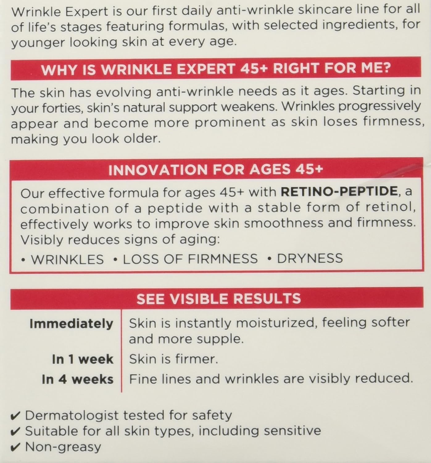 Reduces wrinkles. Restores firmness. 24 hour hydration. Wrinkle Expert is L’Oréal Paris’ first daily anti-wrinkle skincare line for all of life’s stages featuring formulas, with selected ingredients, for younger looking skin at every age. Our anti-wrinkle face cream for ages 45+ formulated with Retino-Peptide effectively works to improve skin smoothness and firmness. Visibly reduces signs of aging including wrinkles, loss of firmness, and dryness.