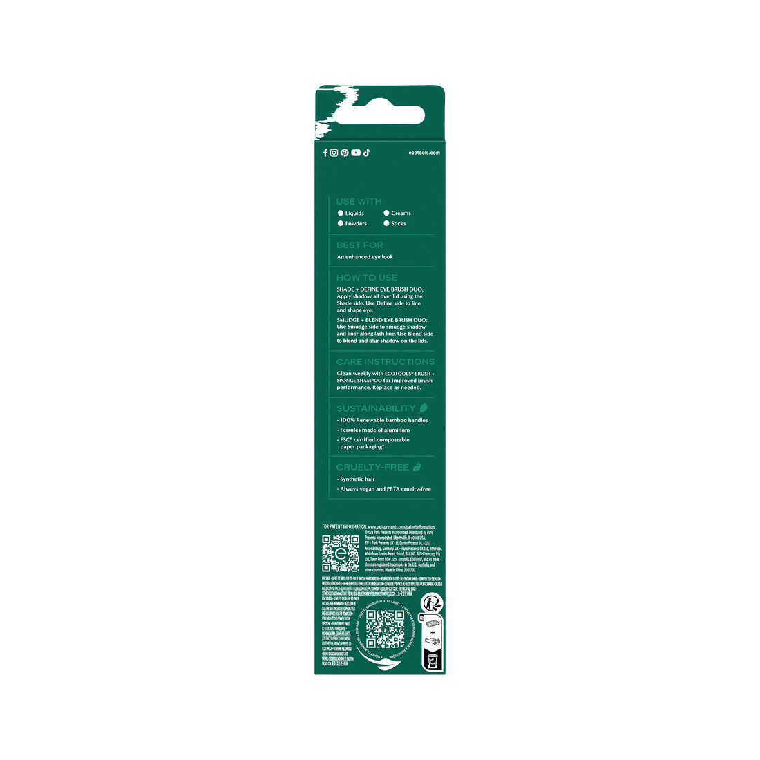 The EcoTools Eye Enhancing Duo Set comes with four different brush heads! This will help you achieve different eye "looks" from day to night with minimal effort. This classic set includes our Shade and Define brush as well as the Blend and Smudge brush. Use the Shade and Define brush by applying the shadow of your choice to the eyelid and then define with the defining brush. Use the Blend and Smudge to blend the eye shadow completely and smudge the shadow or liner along the lash line to complete the look. Whether you are going soft and smoky or big and bold, you'll have the tools you need.