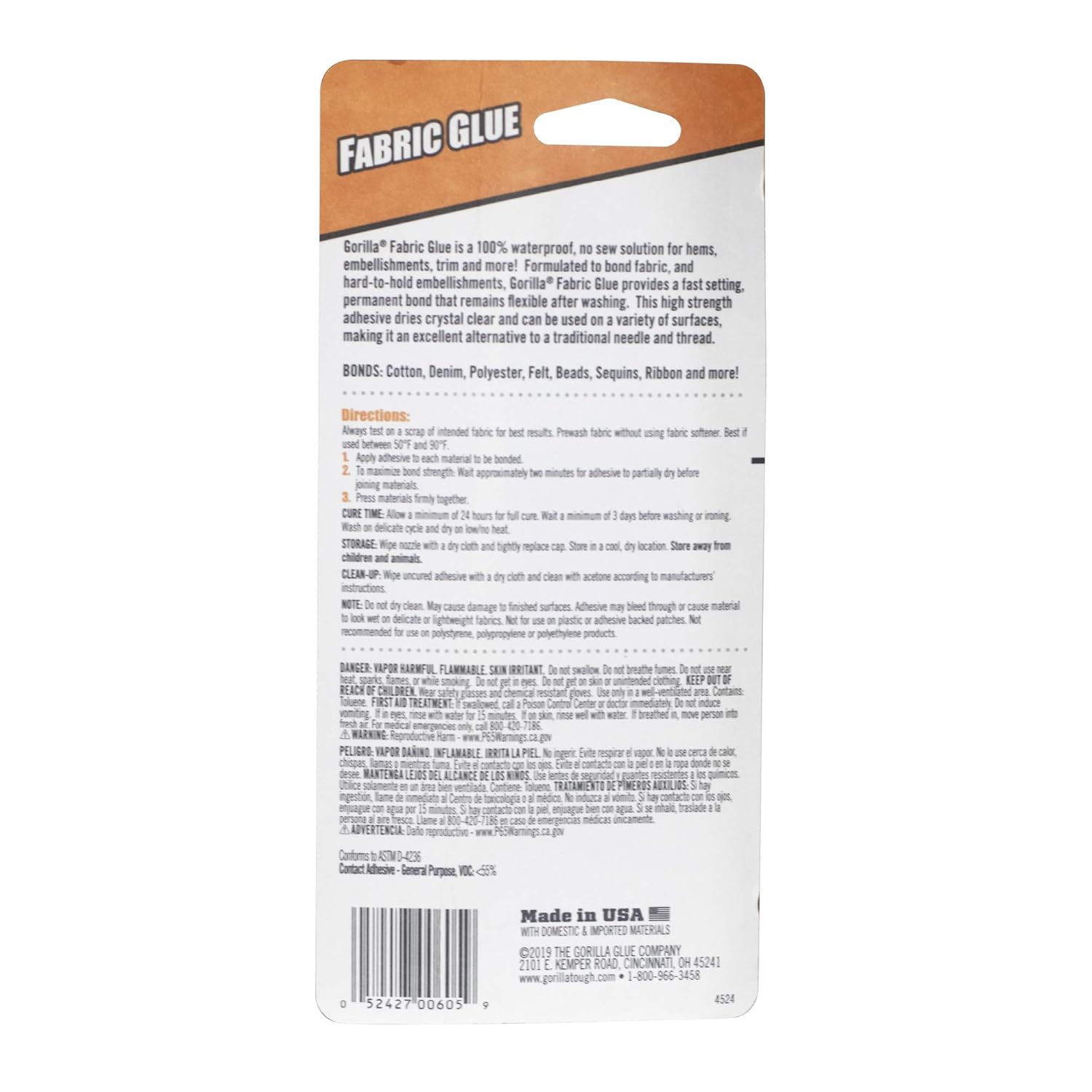 Gorilla Fabric Glue is a completely waterproof, no-sew solution for hems, embellishments, trims, and more. Formulated to bond fabric and hard-to-hold embellishments, this adhesive provides a fast-setting, permanent bond that remains flexible after washing. As a high-strength glue, it will dry crystal clear and is an excellent alternative to a traditional needle and thread. It can be used on cotton, denim, polyester, felt, beads, sequins, ribbons, and more!