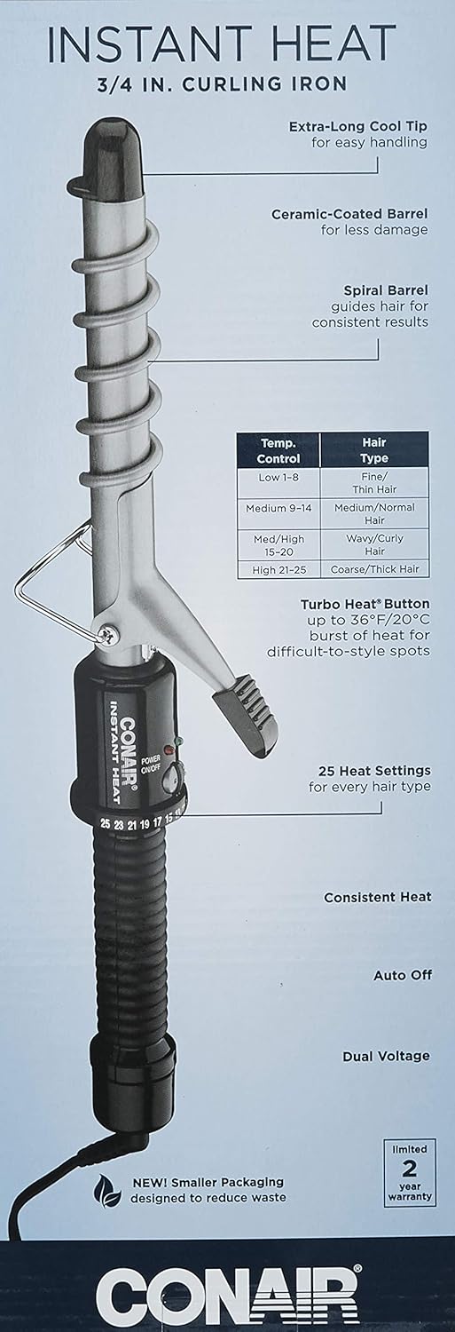 The CONAIR Instant Heat Spiral Curling Iron heats up in just 30 seconds, offering quick and even styling thanks to its Multilayer Barrel Technology. With 25 heat settings and a Turbo Heat Button for an extra boost, it ensures precision and control. The extra-long cool tip and 5-foot cord make styling comfortable and safe, while the Dual Voltage feature is perfect for travel. Ideal for all hair types, it lets you create a variety of curls and waves effortlessly. Trust CONAIR’s legacy of quality hair tools since 1959 for professional results every time.