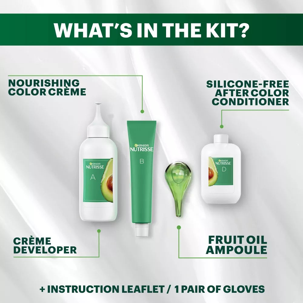 Garnier Nutrisse Ultra Crème Nourishing Permanent Hair Color nourishes as it colors for 2x shinier, silkier and nourished hair vs. uncolored, unwashed hair. Garnier Nutrisse permanent hair dye comes with a fruit oil ampoule that you pour directly into the mix. Our nourishing after color conditioner is infused with five responsibly-sourced oils - avocado, olive, coconut, argan and shea. The new ColorBoost technology efficiently infuses intense dyes into the hair fiber for richer, radiant, and long-lasting color with 100 percent gray coverage. Our non-drip color Crème adapts to all hair textures for even color with beautiful highlights. Pure pigments give you rich, shiny, accurate long-lasting hair color from root to tip. Garnier Nutrisse is cruelty free and formulated without animal derived ingredients.