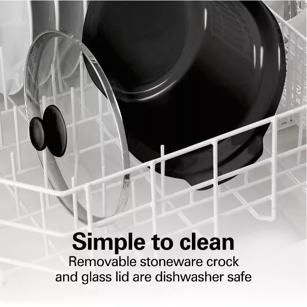 The Hamilton Beach® Stay or Go® 6 Quart Slow Cooker has a clip-tight sealed lid to reduce messy spills when transporting food. Carry hot meals to family gatherings, potlucks or serve at the table without worrying about spills. The slow cooker is the perfect size for family meals and serves 7+ people. The stoneware crock fits a variety of foods, from lasagna and desserts to large cuts of meat. It holds a 6 lb. chicken or 4 lb. roast. From bold chili and stews to savory, slow-cooked meats and rich pasta dishes, you'll easily make delicious, flavorful meals with minimal effort. The removable stoneware crock and glass lid are both dishwasher safe making cleanup a breeze. The heavy-duty handles are easy to grip to make carrying the slow cooker from countertop to table easy.
