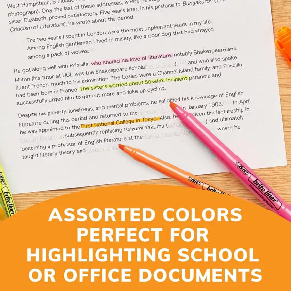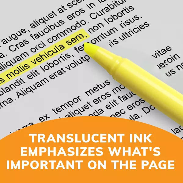 Whether you’re organizing notes or underlining passages in a textbook, BIC Brite Liner Highlighters make it fun, colorful, and easy! These highlighters come in an assortment of highly visible, fluorescent highlighter colors, including yellow highlighters, to make color coding a breeze. Each highlighter features a chisel tip that allows you to seamlessly switch between broad markings and precise, fine lines to effectively callout or emphasize certain information.