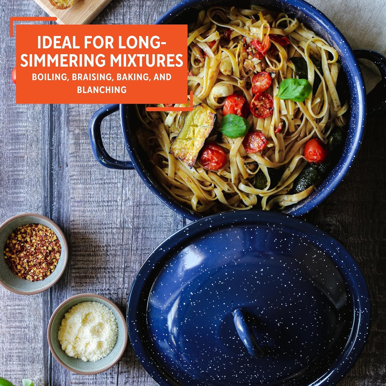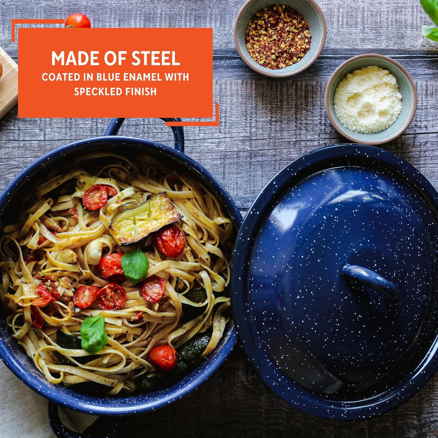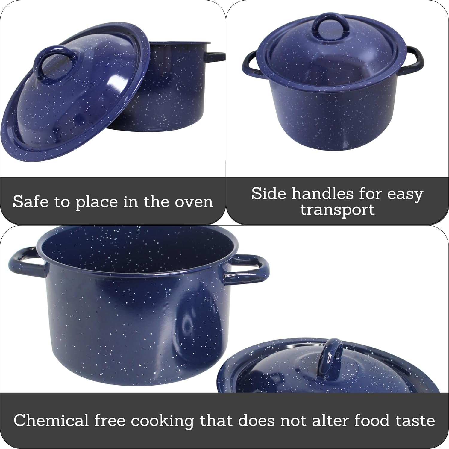 Experience the convenience and versatility of the Imusa Blue Enamel Stock Pot with Lid. With a 12-quart capacity, this multipurpose pot is perfect for cooking hearty soups, flavorful stews, rich sauces, comforting pasta dishes, and more. Whether you're preparing for a family gathering or meal prepping for the week, this Cooking Pot will become an essential part of your kitchen. Made with durable steel and coated in a stunning blue enamel with a speckled finish, this pot offers superior heat retention and distribution, and is oven safe for even more cooking options. Say goodbye to harsh cleaning chemicals and hello to effortless clean-up with the smooth glass enamel surface. Don't miss out, add this Soup Pot to your kitchen collection today!