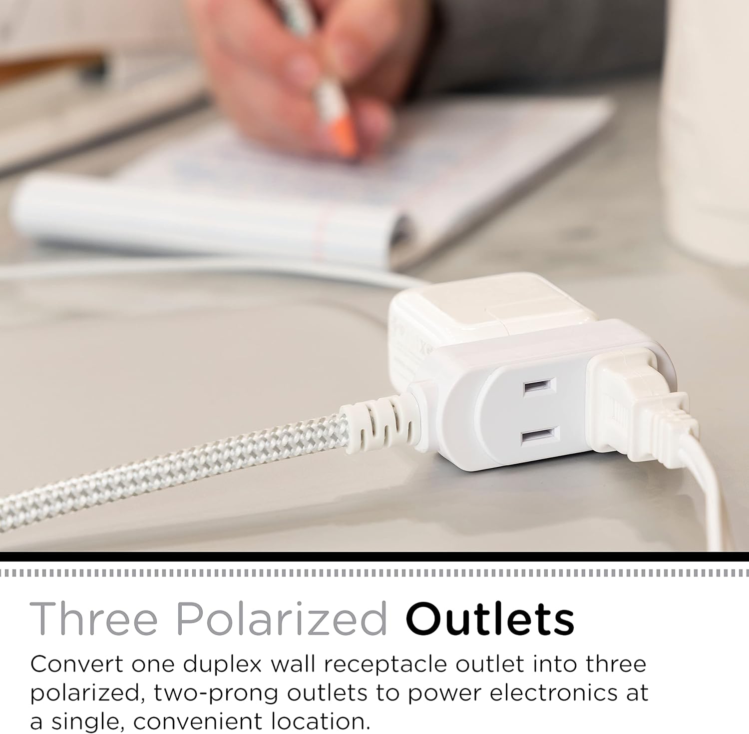 The cordinate Basic 3-Outlet Polarized Extension Cord offers convenient power access with three polarized outlets ideal for lamps, appliances, chargers, and more. Its extra-long 15-foot cable ensures you can easily reach distant sockets. Featuring a stylish chevron-patterned braided fabric, this cord adds a decorative touch while preventing tangles and clutter. The slim flat plug design lets you place furniture closer to walls, saving space. Plus, built-in slide-to-close safety covers protect you from electrical shocks when outlets aren't in use, combining style, function, and safety in one.