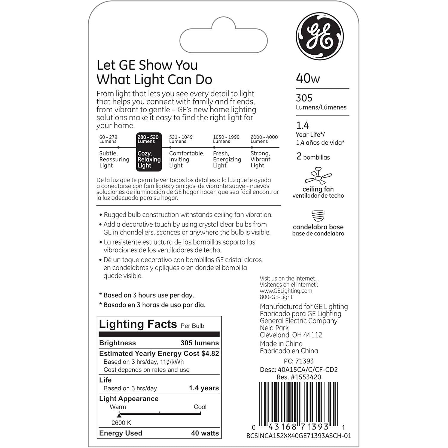 These A15 bulbs feature a candelabra base designed specifically for ceiling fans, delivering 305 lumens of warm, inviting light. Each bulb lasts approximately 1.4 years when used for 3 hours daily, ensuring long-lasting comfort and ambiance.