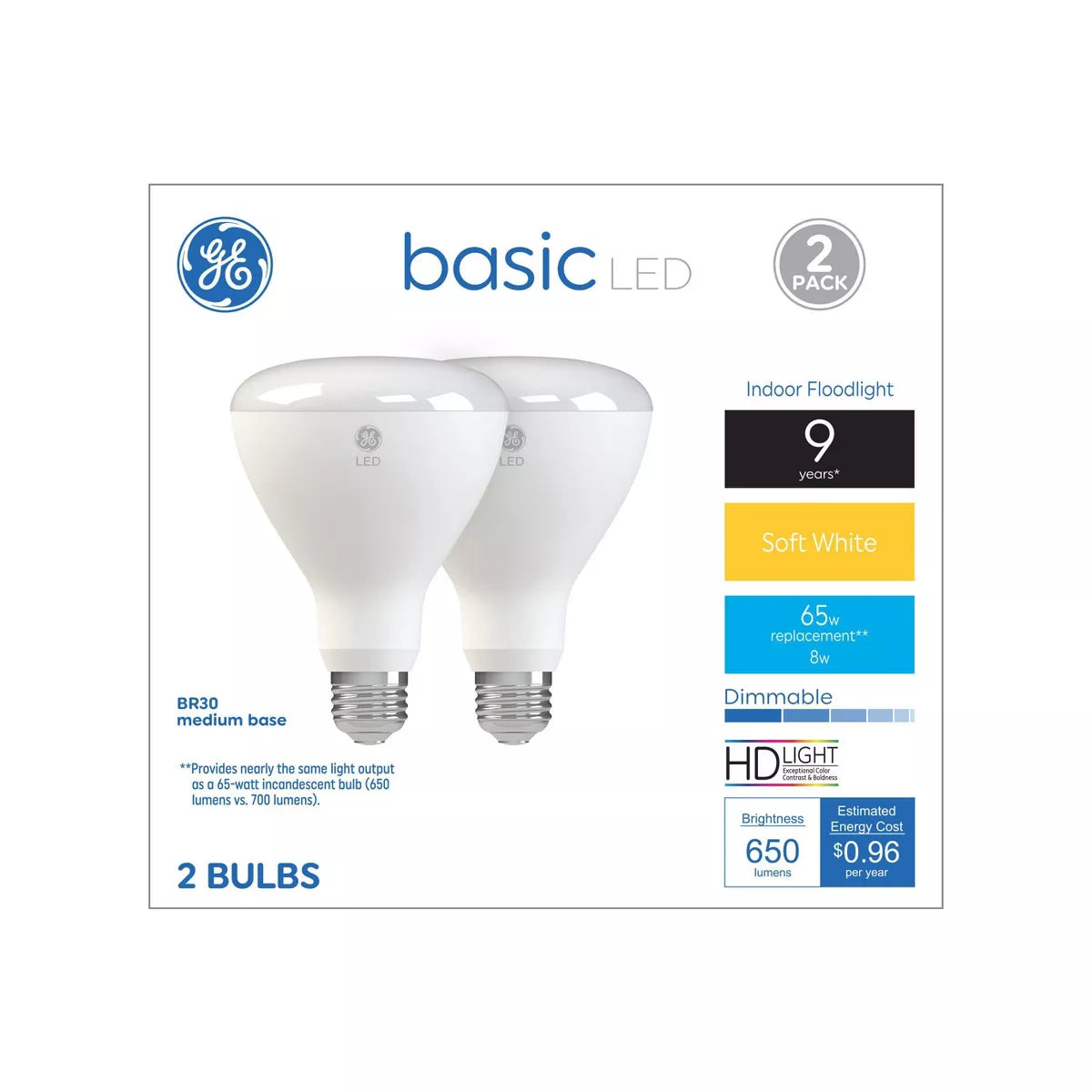 GE Lighting 65W Basic BR30 LED Indoor Floodlight Bulbs Soft White: Dimmable, 650 Lumens, 2700K, E26 Base, 2 pack-043168481939-LR-348654-1-LR eShop