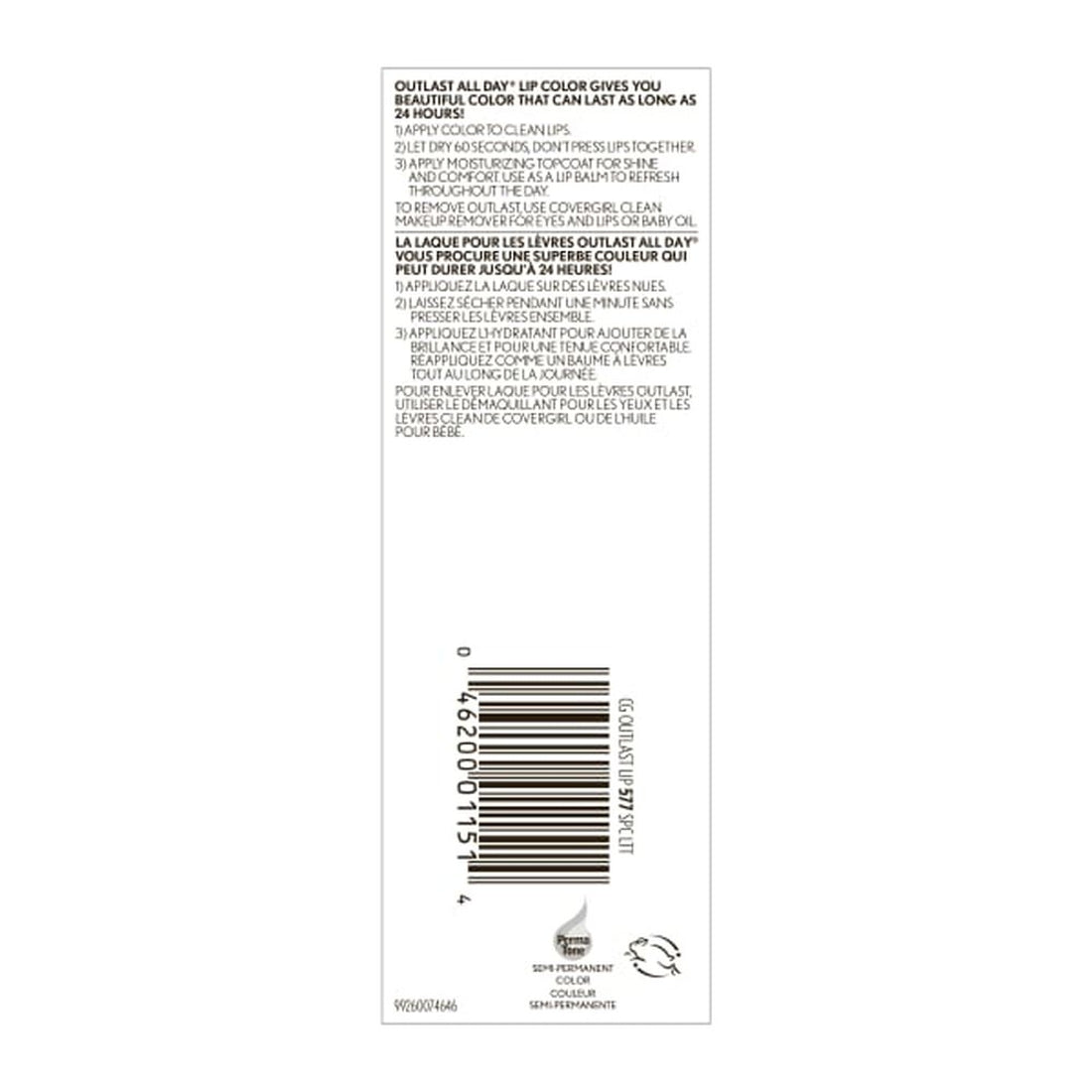 Get brilliant lip color that lasts with COVERGIRL Outlast All-Day Lip Color. This advanced formula keeps lips looking vibrant and fresh for up to 24 hours. The nourishing topcoat locks in color and provides instant moisture for soft, shiny lips. And feel free to smooch away—this transfer-resistant lip color is kiss-proof, smudge-proof, and food-proof. Pair with any COVERGIRL Outlast foundation for an all-day, worry-free look.