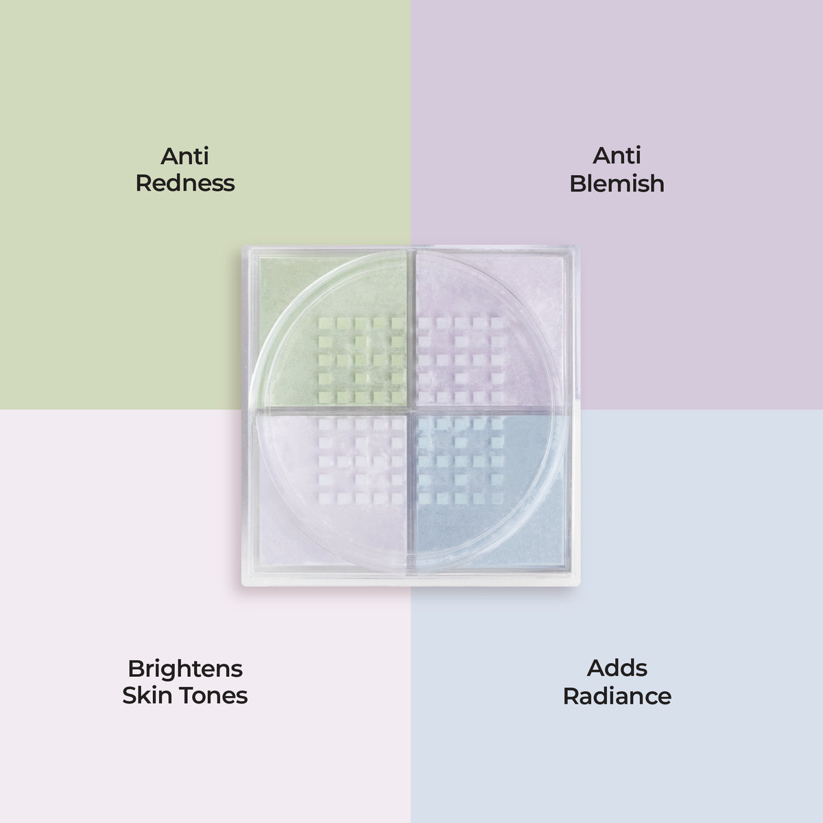 MCoBeauty Correcting Quad Loose Powder blends four loose pigments into one complexion powder, instantly refining the appearance of your skin. Micro-fine particles in Green, Lavender, Purple, and Blue combine to even the look of skin tone and texture concerns with illuminating, brightening, neutralizing, and color-correcting effects.