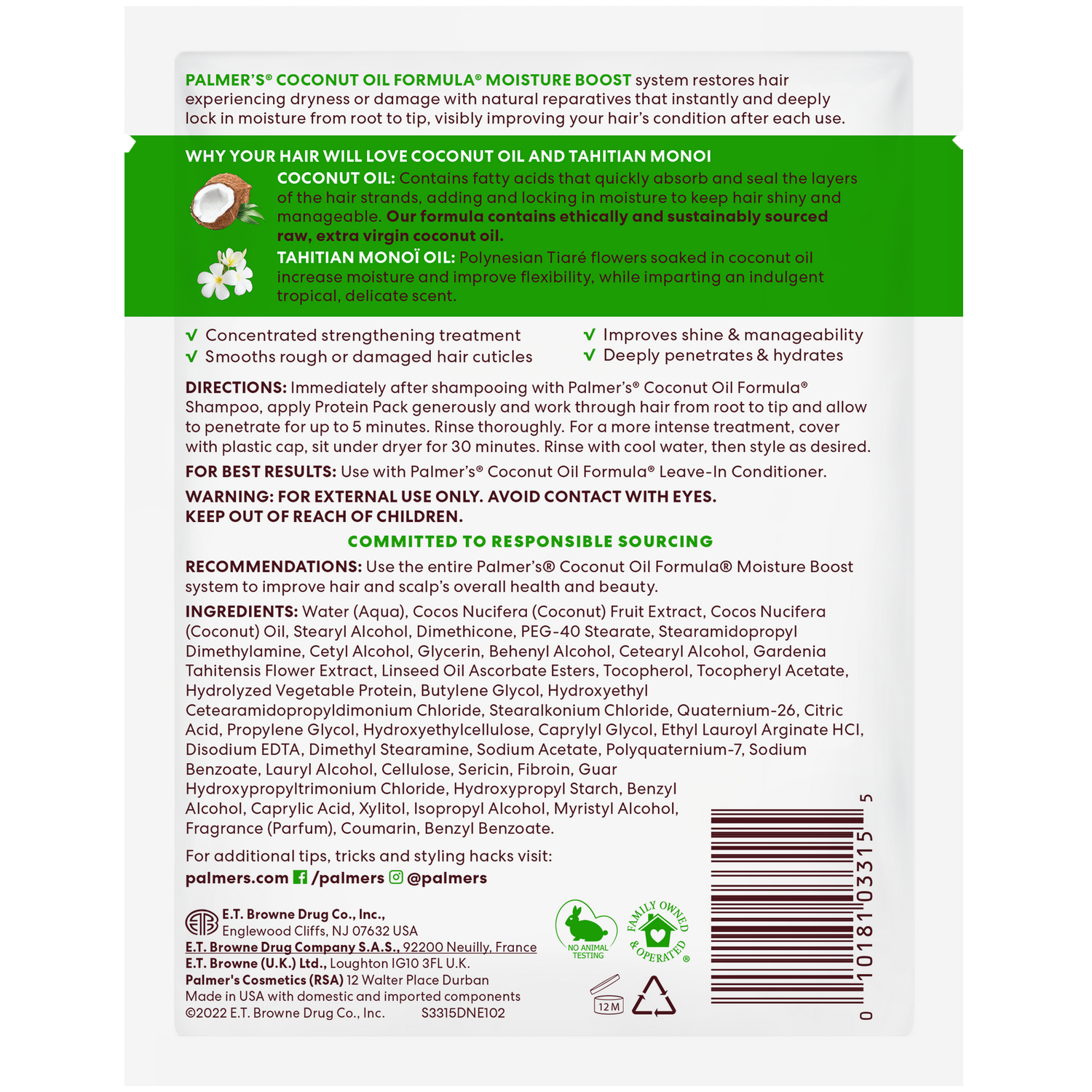 Palmer's Coconut Oil Formula products contain ethically and sustainably sourced Coconut Oil and Tahitian Monoï, infused with Tiaré flower petals. These raw, natural ingredients deeply hydrate, repair damage and give hair incredible shine. Palmer's Coconut Oil Formula Coconut Oil Deep Conditioning Protein Pack is a moisture-intensive treatment that helps strengthen and repair weak, fragile or damaged hair.
