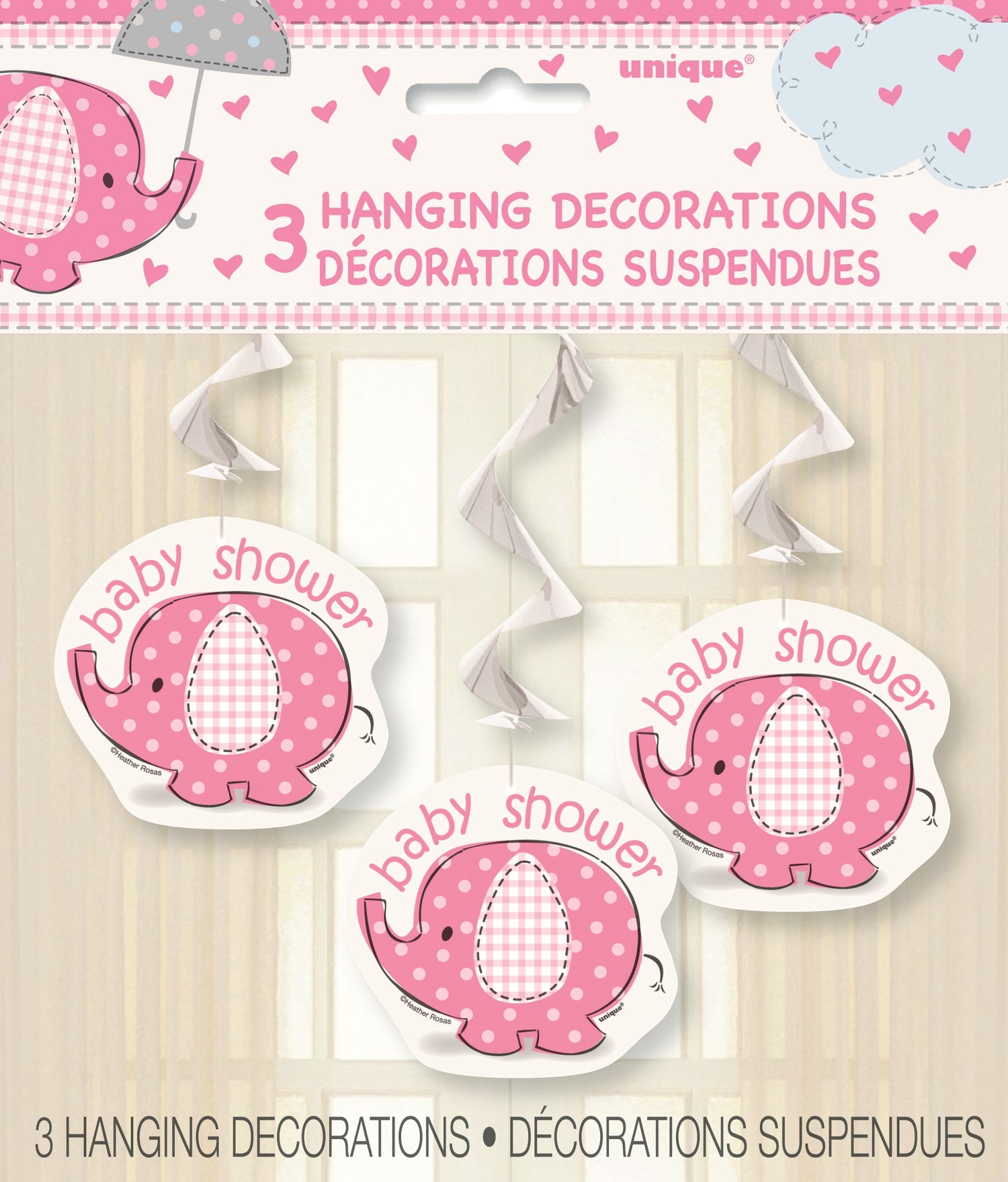 Add charm to your baby shower with the delightful Unique Baby Shower Pink Elephant Hanging Swirl Decorations. Each package contains three 26-inch swirls featuring cute pink elephant cutouts, perfect for celebrating your baby girl. Crafted from high-quality foil and paper, they include loop strings for effortless hanging. Enhance your party décor by pairing them with Unique's extensive selection of pink elephant baby shower supplies.
