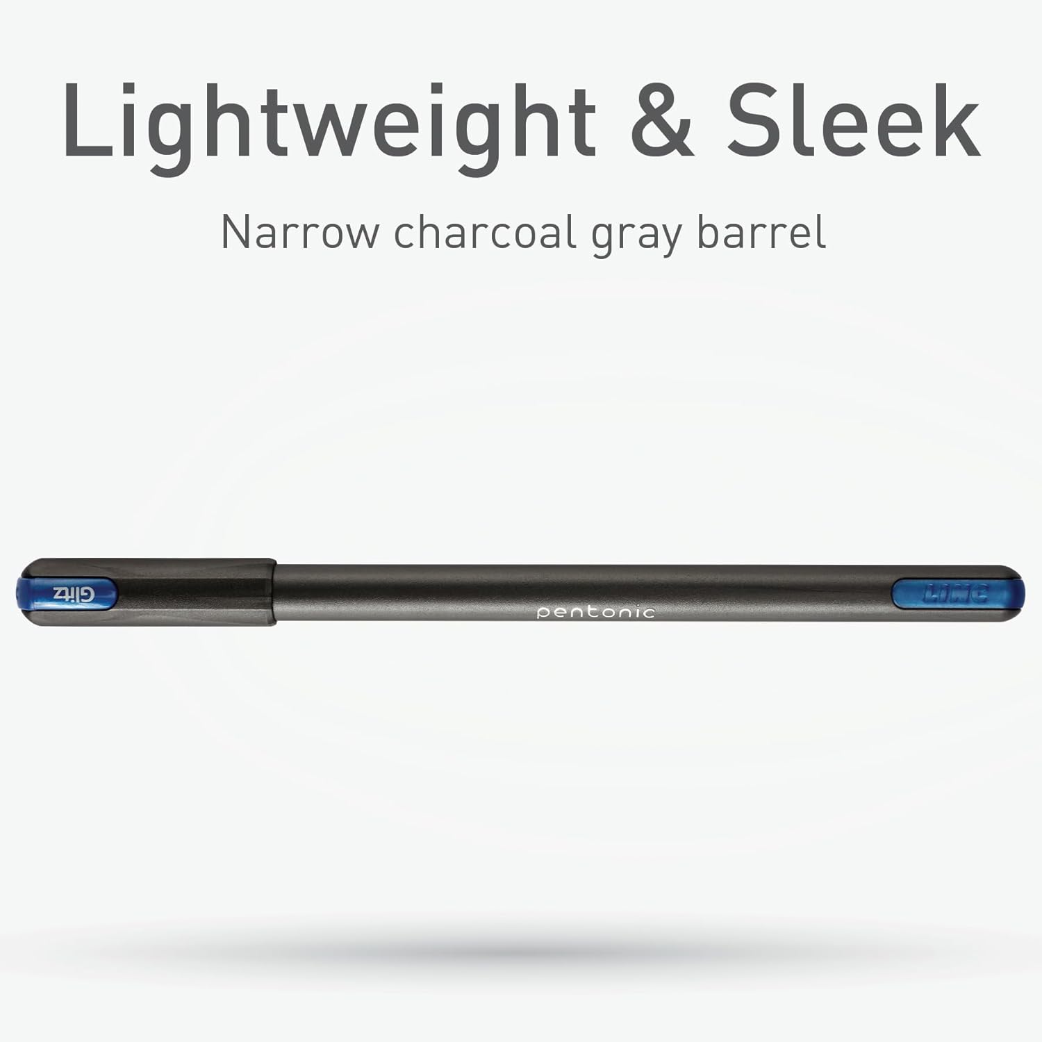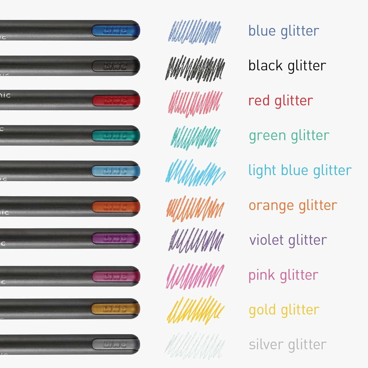 This set of Pentonic Glitter Gel Pens includes 10 pens in assorted colors: black, red, green, blue, light blue, orange, purple, pink, gold, and silver. The medium 1.0 mm tip allows for bold lines, making these pens perfect for notes, drawings, and larger handwriting. These gel pens dry quickly and are suitable for use on a variety of paper types. We use low-viscosity ink for a seamless writing experience, making these pens ideal for journaling. Each pen features a matte black barrel and nickel silver tip.