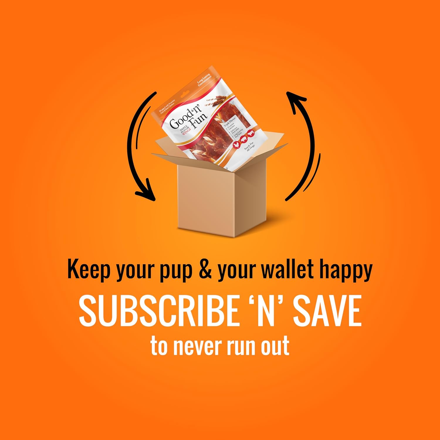 Tails will be wagging for these flavor-packed Good ‘n’ Fun® Triple Flavor Wings, made with a savory combination of three flavors that dogs love most. These delicious chew treats are made from the finest pork hide and rawhide, then wrapped with real chicken to create a truly delightful, long-lasting rawhide treat your dog will love. High in protein, Good ‘n’ Fun Triple Flavor Wings are a healthy and delicious way to satisfy your dog’s natural urge to chew. The natural action of chewing also helps reduce tartar buildup and remove plaque. These flavorful chews make for long-lasting entertainment.