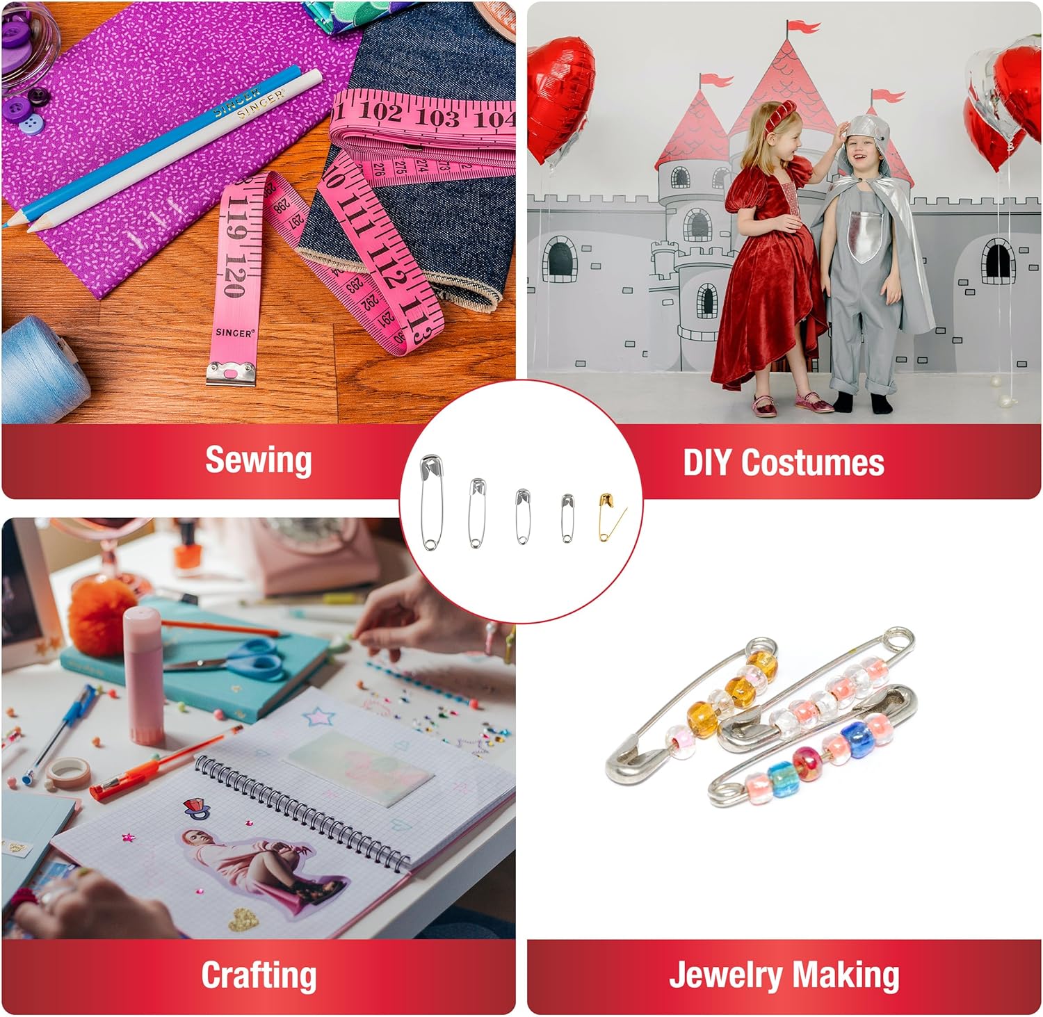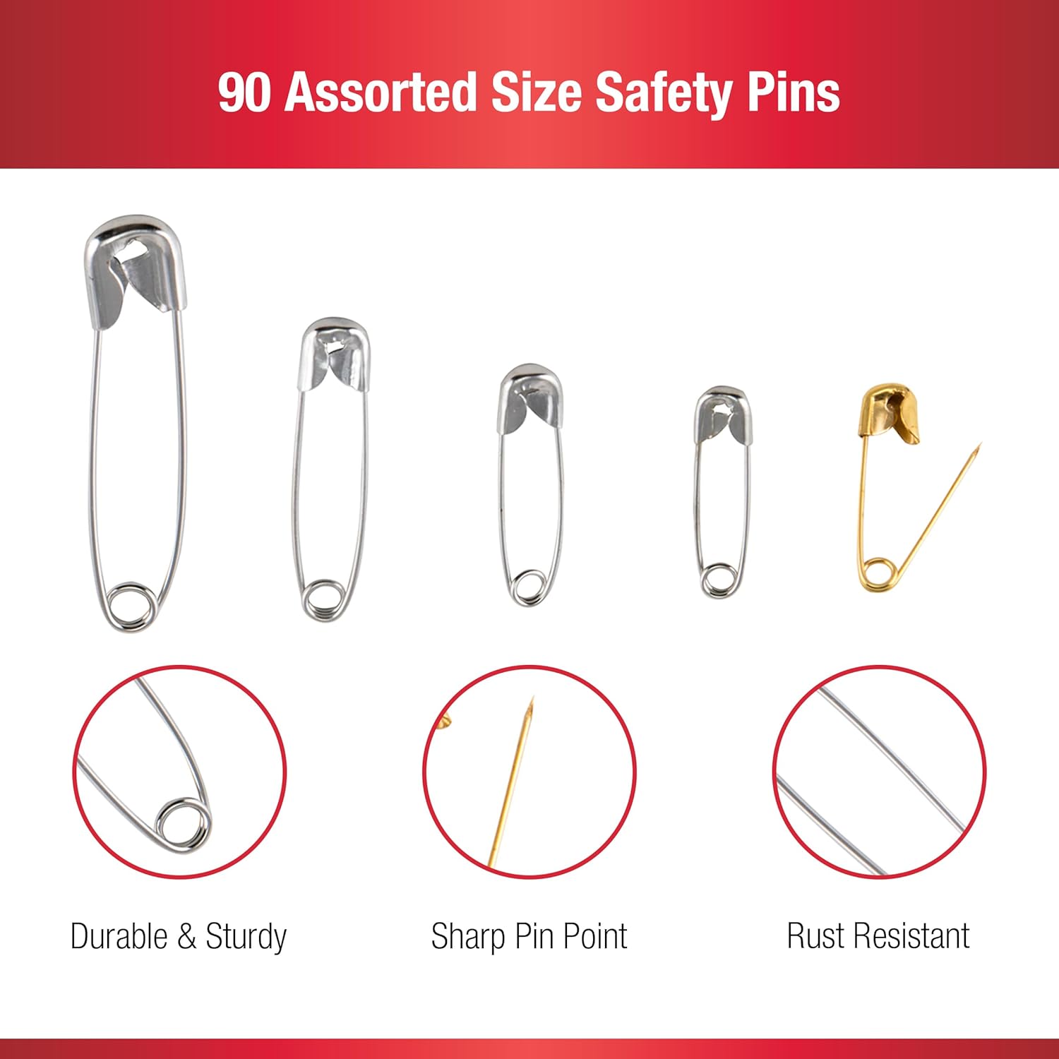 Used by sewers, crafters, and everyone in between, a collection of multi-sized safety pins is the perfect bulk purchase to ensure your needs are met. Four different sized safety pins offer use for quilting, crafts and garment fixes. This package includes 90 safety pins. Sizes include 00 – ¾ inch, 0 – 7/8 inch, 1 – 1 1/16 inch, and 2 – 1 ½ inch. Fasteners are made of nickel-plated steel, and gilt plated steel, which are rust-resistant and durable.