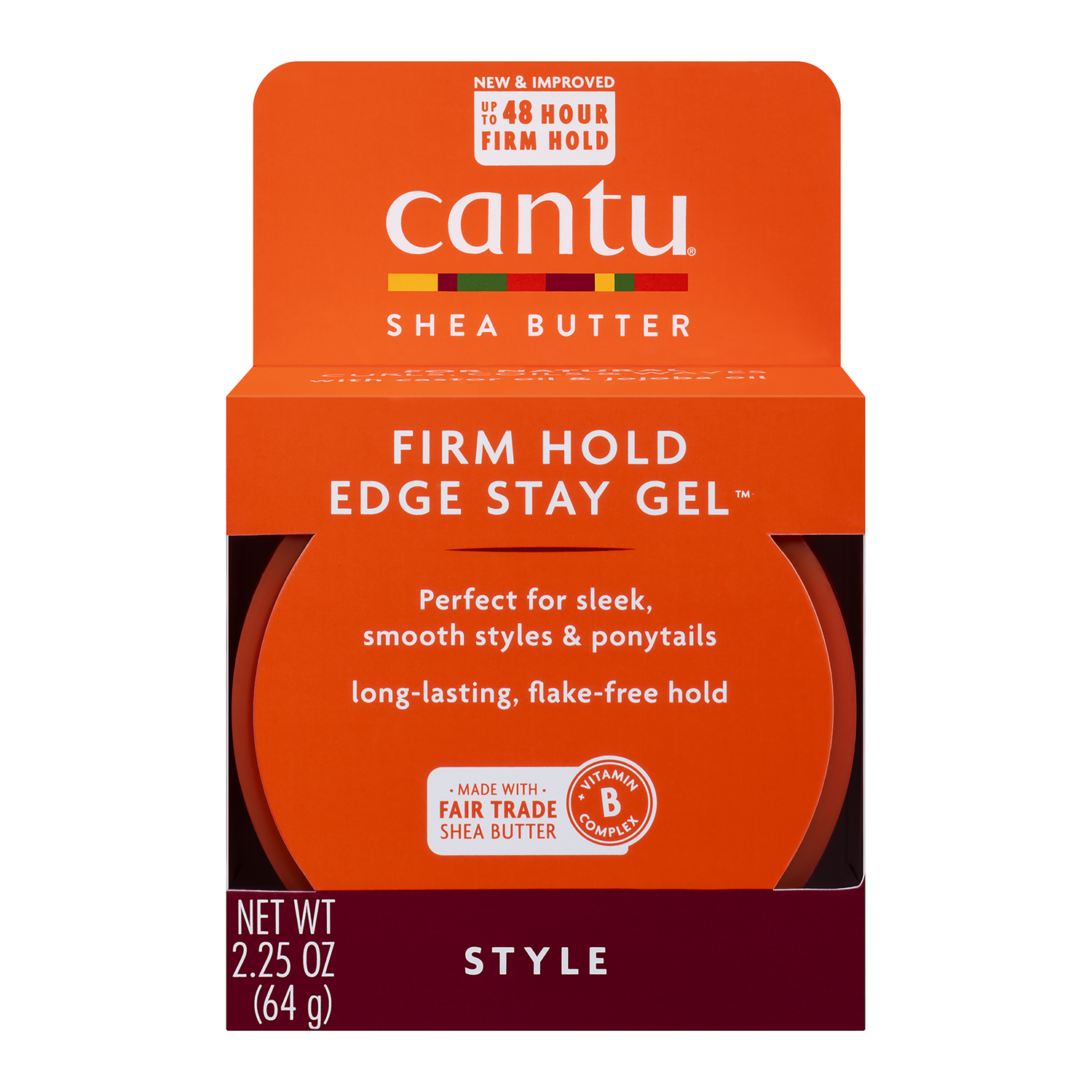 Cantu Extra Hold Edge Stay Gel conditions and smoothens frizz and flyaways for shiny, sleek styles that last. Keeps styles long-lasting and flake-free. Made with pure Shea butter to condition and add shine to natural hair making it perfect for sleek, smooth styles and ponytails