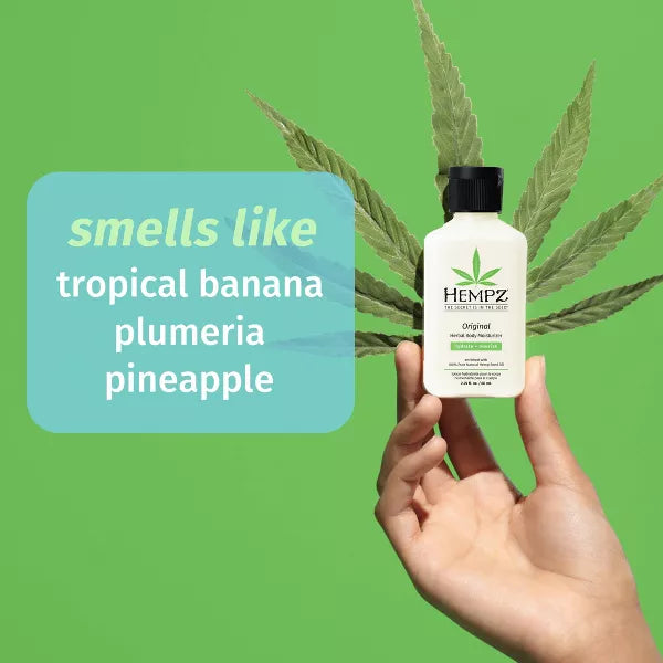 Help condition skin with the pure hemp seed oil in this vegan lotion that tempts the senses with a floral-and-banana fragrance. Hempz Original Herbal Body Moisturizer is enriched with 100% Pure Organic Hemp Seed Oil and blended with natural extracts to provide dramatic skin hydration and nourishment to help improve the health and condition of skin. Hemp Seed Oil is one of nature's richest sources of Essential Fatty Acids and Key Amino Acids containing natural proteins, vitamins, antioxidants, and minerals, vital for healthy skin conditioning. Paraben Free, Gluten Free, 100% Vegan, THC Free, Cruelty Free.
