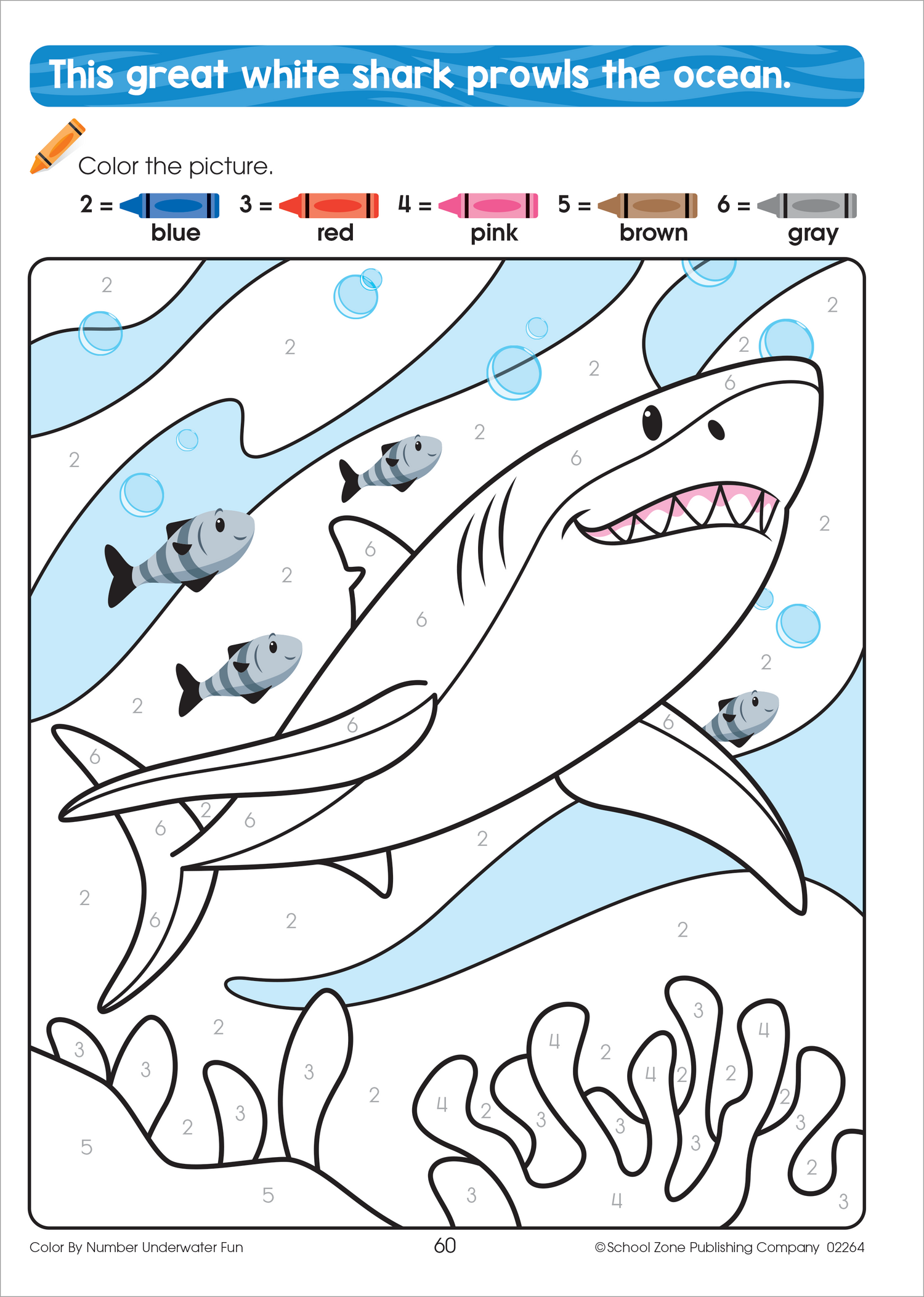 Kids dive into learning as they turn amazing aquatic animals into creative, color-by-number masterpieces. The picture is divided into areas with a number inside. Kids match the number to the designated color shown in the key, and soon they will discover (and color) a moray eel out looking for a meal, a manta ray soaring over the seabed, a narwhal bobbing along in the Arctic sea, and so many more cool creatures. In this workbook from the Activity Zone® series kids practice numbers 1-12 but also learn to follow directions, improve focus, develop fine motor skills, and stretch their imagination. How exciting!