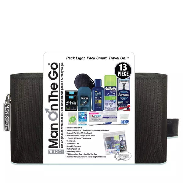 All your travel essentials for men in one travel kit featuring great brands. Contains travel essential toiletries: Gillette TGS Shave Gel 2.75 oz., Barbasol Ultra 3 Disposable Triple Blade Razor, Suave 3in1 Shampoo/Conditioner/Body Wash 3 oz., Degree for Men A/P Deodorant .5 oz., Dude Wipes (2), Crest Toothpaste .85 oz., Toothbrush, Toothbrush Cover, Dentek ADA Accepted Flossers 3 ct., Palm Scalp Brush, TSA Compliant Quart Size Zip Top Bag. Great travel kit for the gym, hospital bag essentials and travel.
