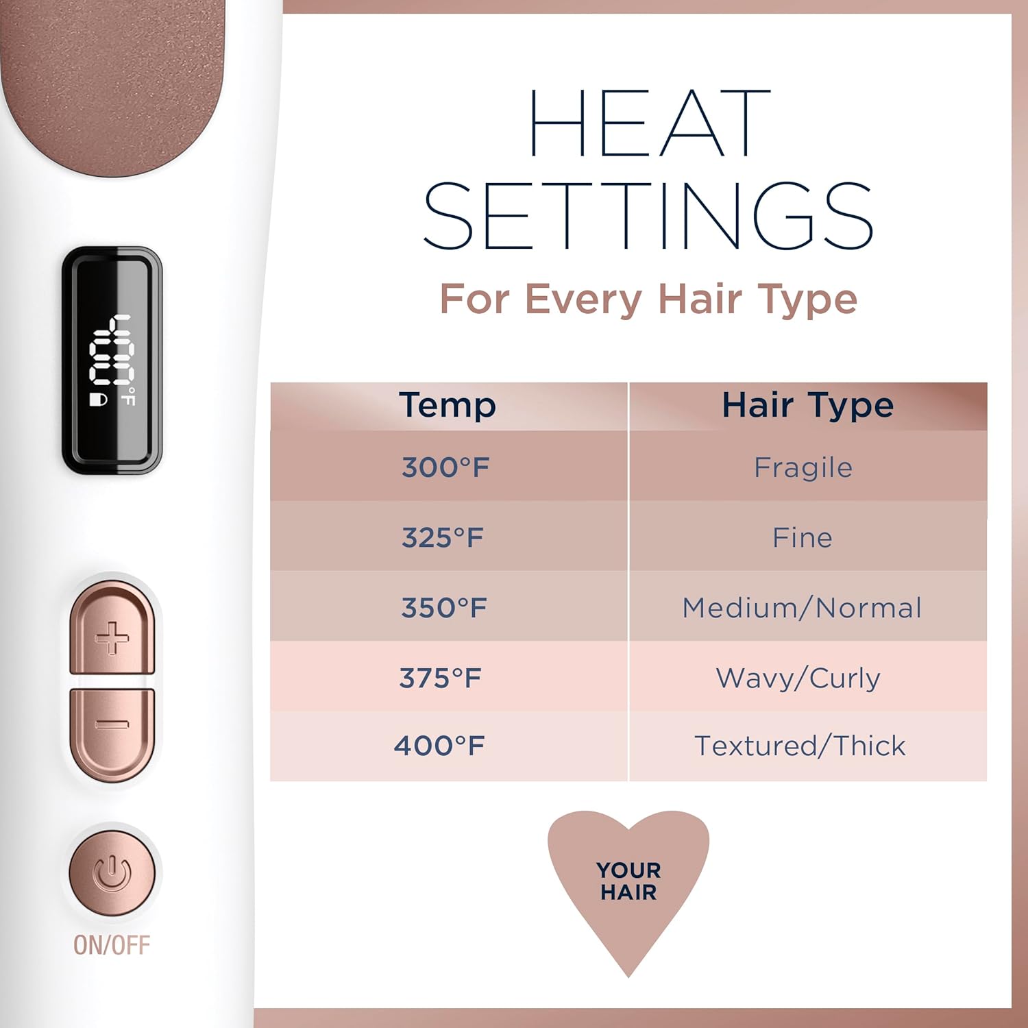Get the smooth, shiny looks you love quickly and easily with the Conair® Heated Straight Brush. Designed with V-shaped bristles that gently grip hair as you style, this versatile, salon-caliber tool features anti-scald heated plates that ensure better contact with hair for smoother results with less damage. The high ceramic content from the double ceramic coating ensures even heat for fast results that last. Choose from 5 LED heat settings to vary the temperature up to 400°F, depending on your hair type. Ideal for all hair types, from thin and fragile to thick and textured, the brush heats up in seconds, so there's less waiting and more styling. Show your hair some love with the styling essential that glides through it for a flawless finish, leaving it healthy-looking and manageable with silky, mega-watt shine.