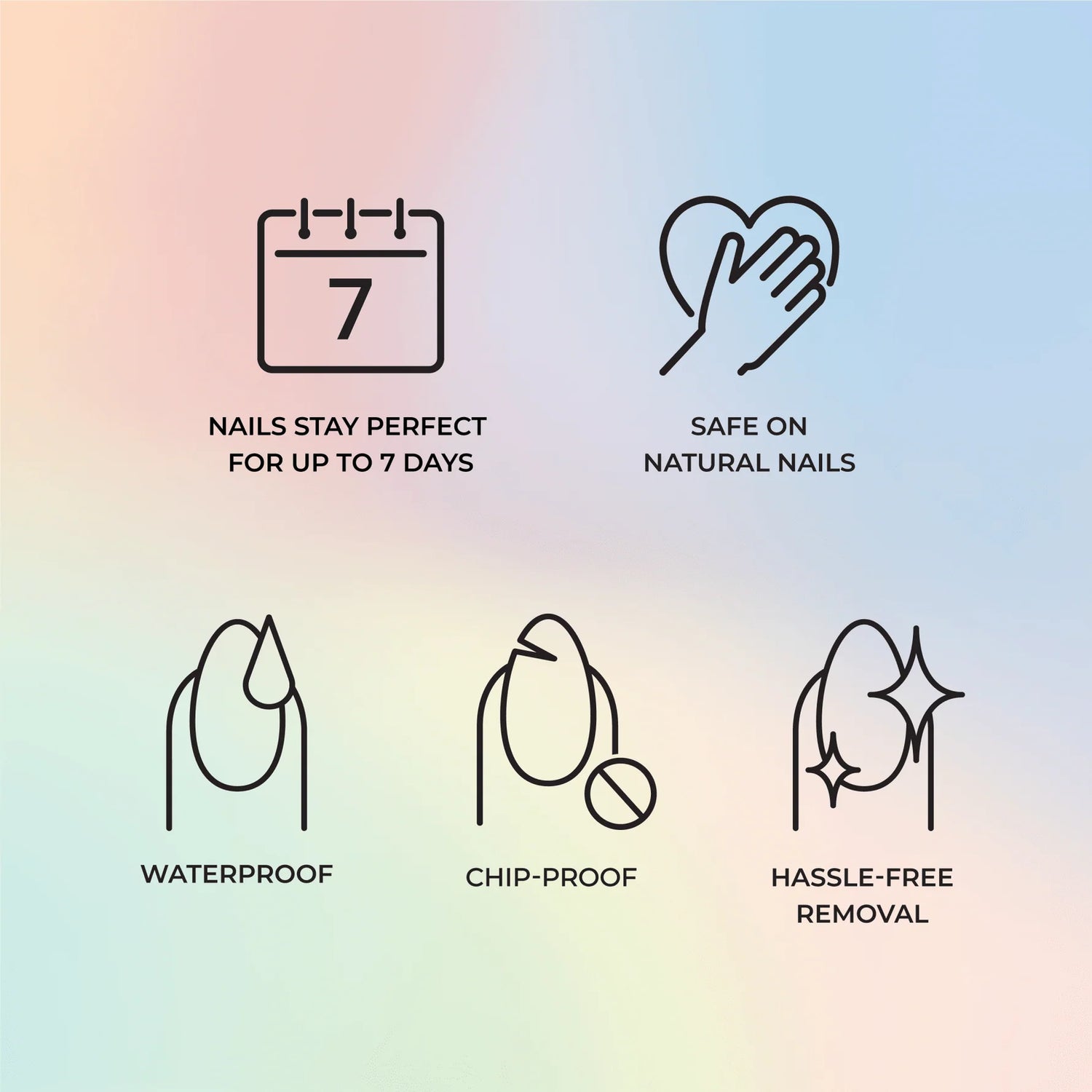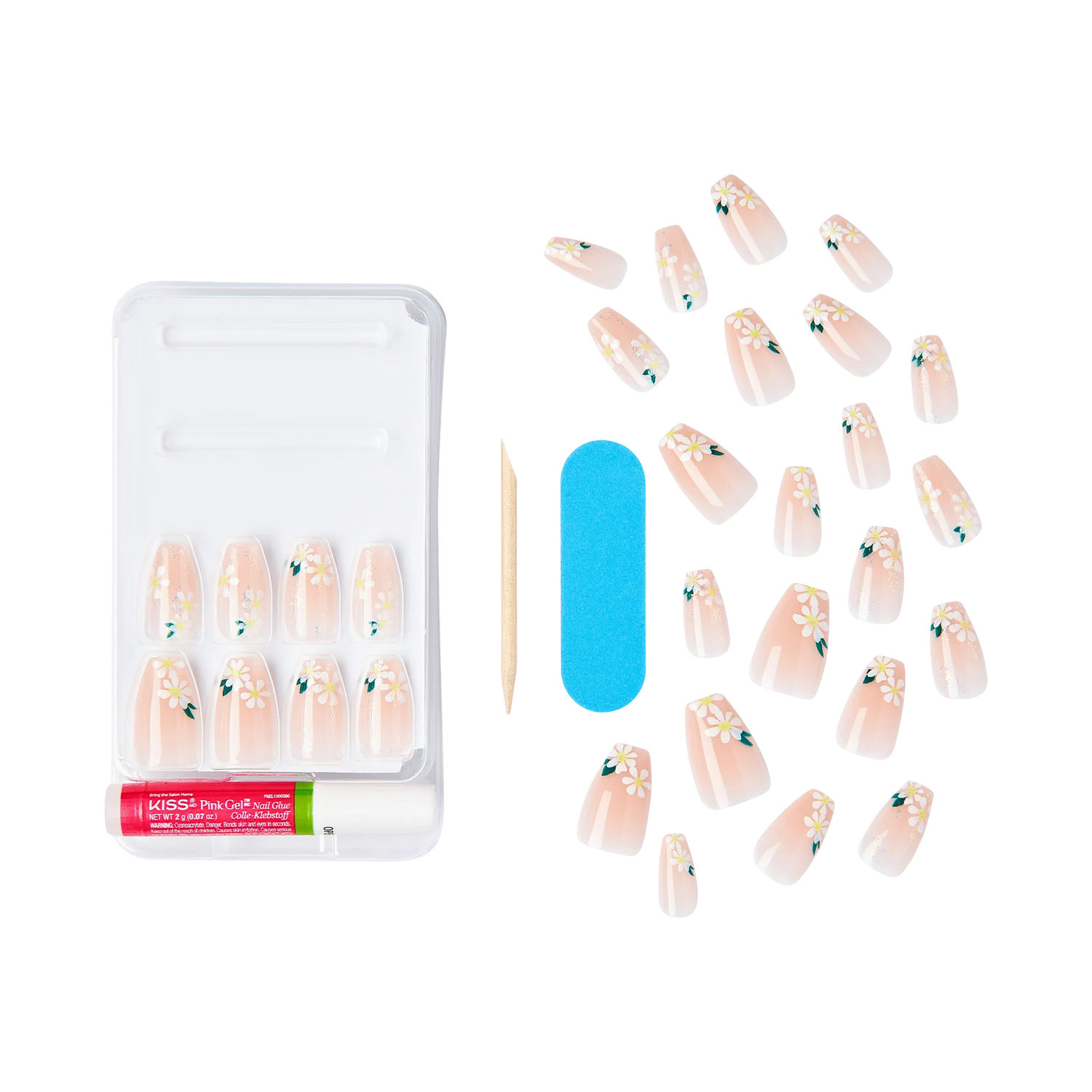- Nail kit contains 28 Fake Nails, Pink Gel Nail Glue (2g), Mini Nail File, & Manicure Stick