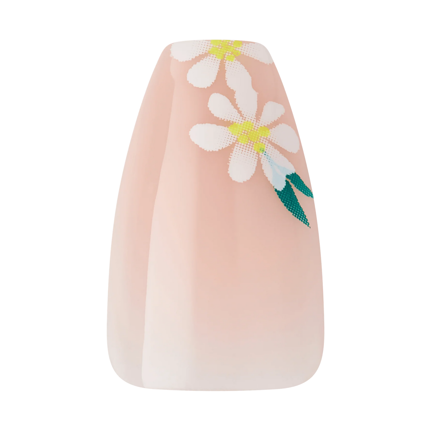 - Nude fashion nails with a daisy design are medium length & coffin shaped