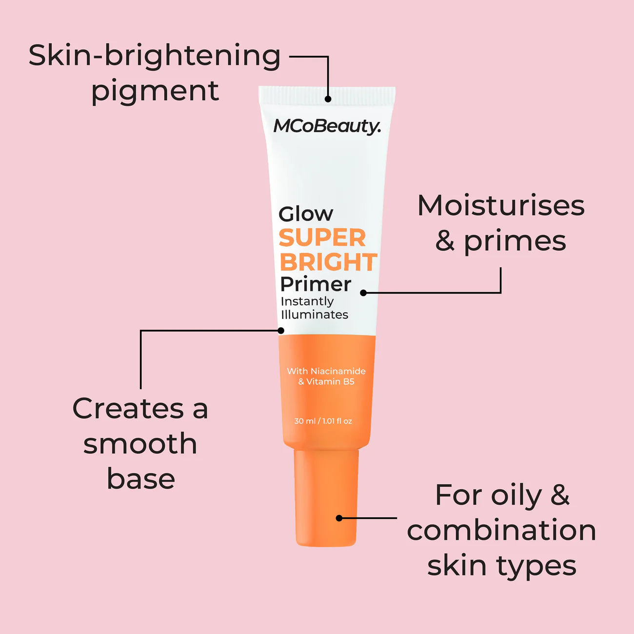 MCoBeauty Glow Super Bright Primer works instantly to give your complexion a lit-from-within glow to create the perfect, long-lasting radiant base for all-day makeup wear. Suitable for combination and oily skin types, this skincare infused primer contains light reflecting particles to smooth and illuminate skin in just one step for a subtle, radiant glow. Enriched with Niacinamide & Panthenol, this lightweight primer works to reduce the appearance of blemishes for dewy skin, to help you glow from inside and out. More than just another step in your makeup routine, this skincare-makeup hybrid is the perfect priming base for all your beauty needs!
